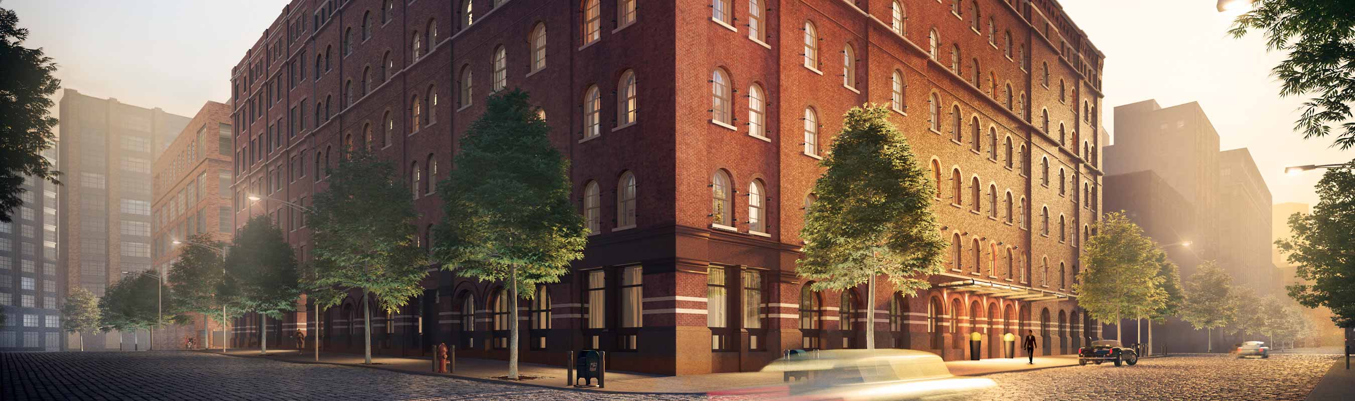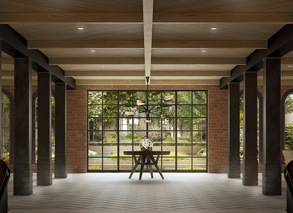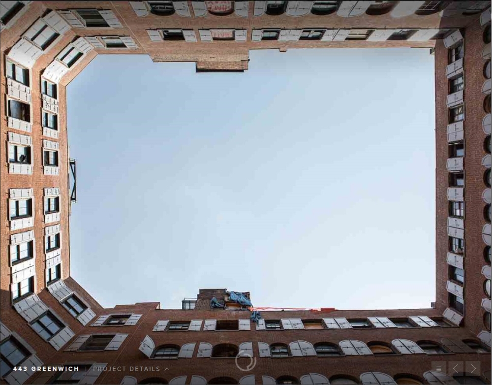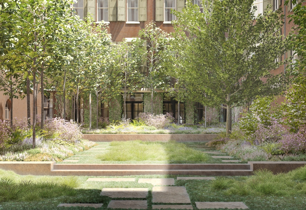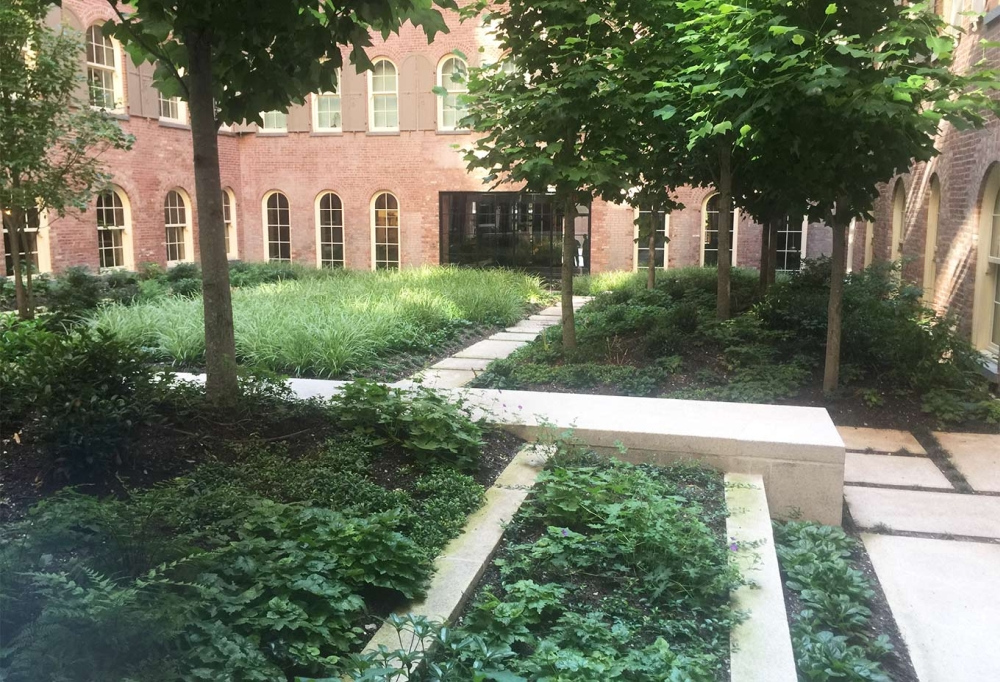 The qualities and sensibilities of European residential building garden courts inspired 443 Greenwich Street's central garden court. Set within one of TriBeCa's most distinctive residential use adaptations of the late nineteenth-century light industrial buildings, it is an unexpected garden discovery. The garden’s three-sided and central location creates an all-encompassing presence upon entering the building's lobby. Imagine the surprise of discovering a slice of Hudson Valley woodland preserves inserted within the building's windowed central court. Tall native columnar Tulip tree groves accentuate the courtyard's volume. The garden's shade-loving woodland habitat offers seasonal floral, textural, and evolving colors to attract residents' daily attention as a reminder of its refuge resource. The grove's thicket of trunks and leafy canopies provide sun protection for south-facing apartments, some filtered privacy, and visual and spiritual connections to the garden's seasonal evolutions.