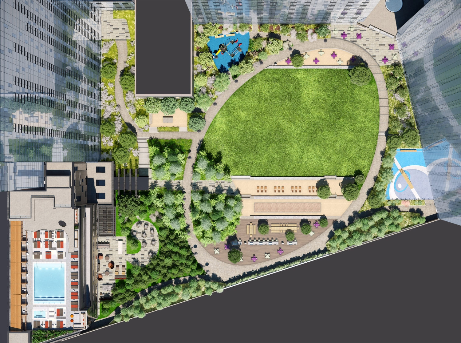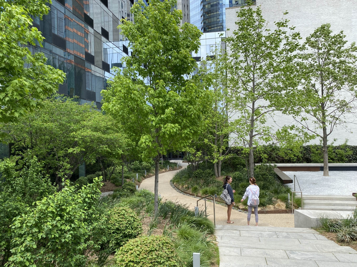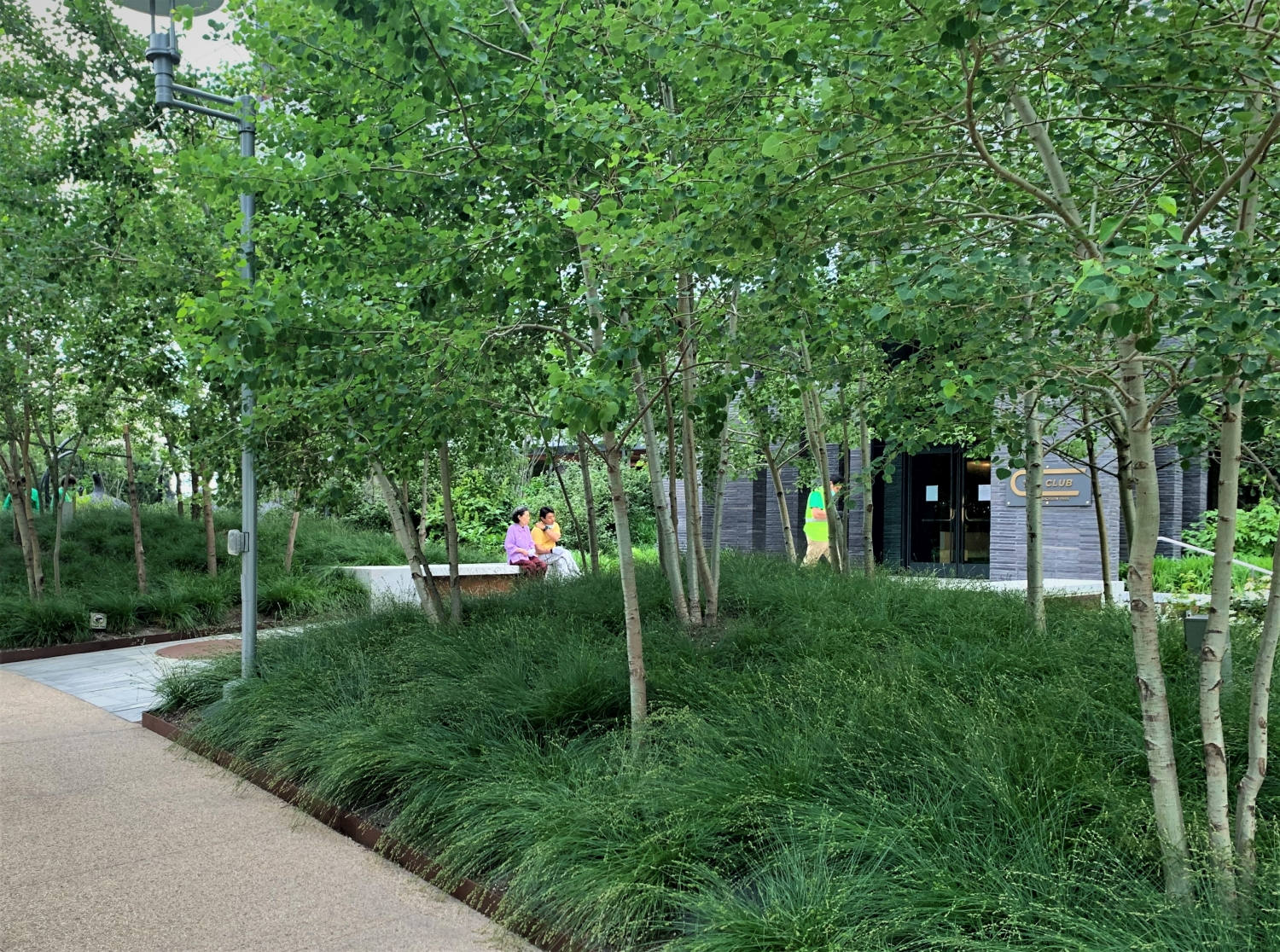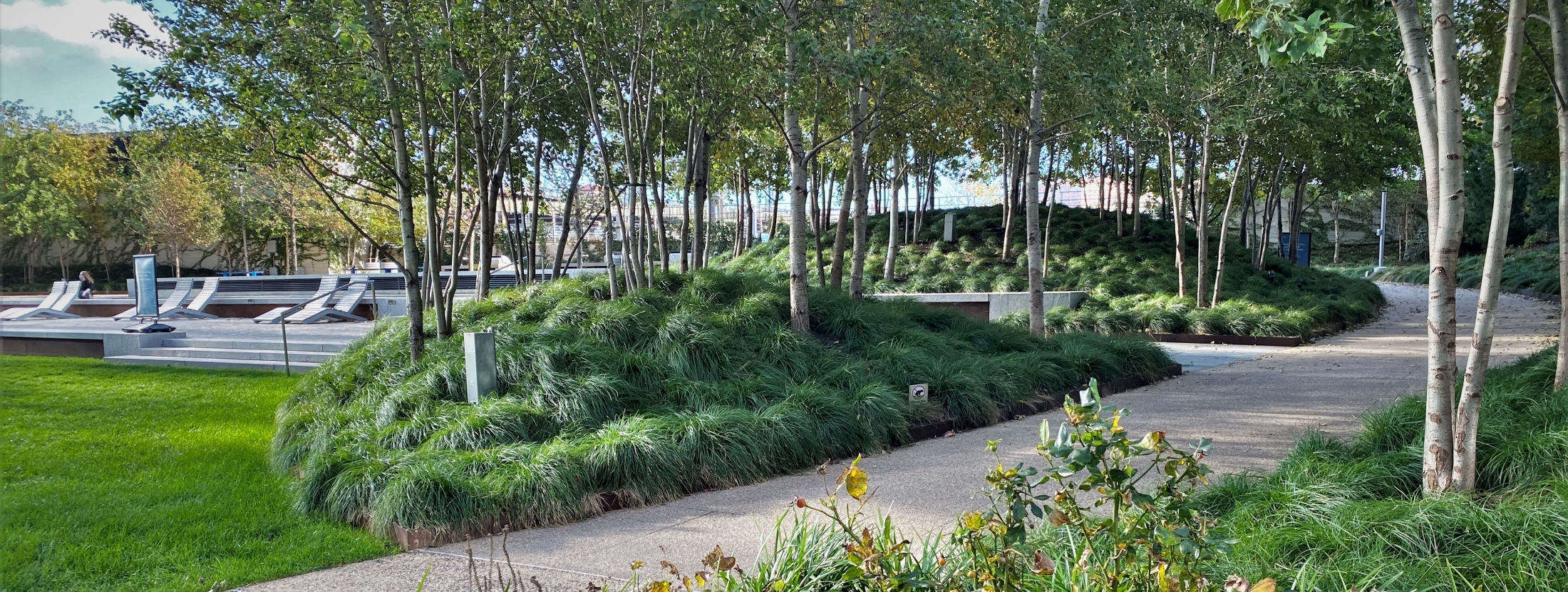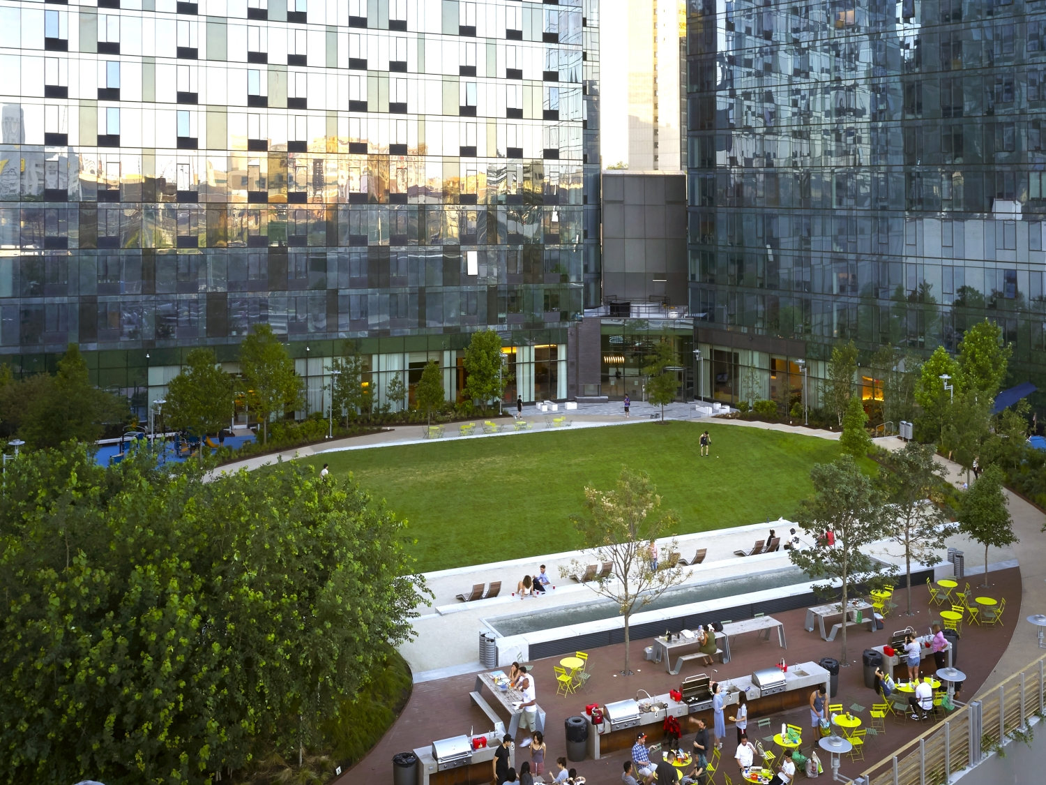 Framed by three 40 plus story towers, a 1 ½ acre common open space landscape emerges as the identity feature after which this mix-used residential development’s is named. Functioning like a historic town green, Jackson Park’s landscape is a community gathering center and residents’ social heart and oxygenating soul. Servicing more than 700 apartments, it offers a variety of popular passive and semi-active recreational amenities which are spatially organized around a large open lawn. The lawn’s central location is defined by a regionally based woodland landscape that permeates out from the buildings’ foundations. The woodland hosts a complimentary network of plant types and companion communities through which a network of garden walkways link building entries and access a collection of distinct activities spaces. Visual and functional clarity is achieved through a cohesive landscape character as the Park’s primary spatial structure. Adjacent to the vast and open LIRR rail corridor, the landscape’s scale, density, and critical mass buffers its transit and industrial context. References to the neighborhood’s industrial commercial heritage inspired the design of the park’s site elements and materials. Proximity to the East River and its original ecology informed the landscape’s plant communities to deepen connections with its environmental and urban development heritage.