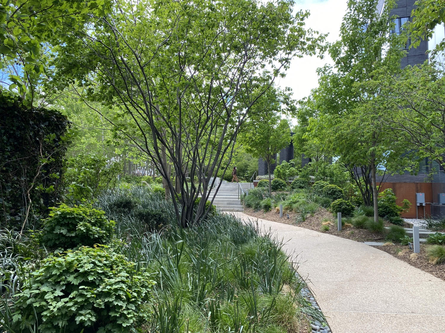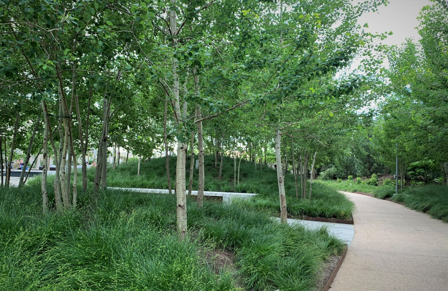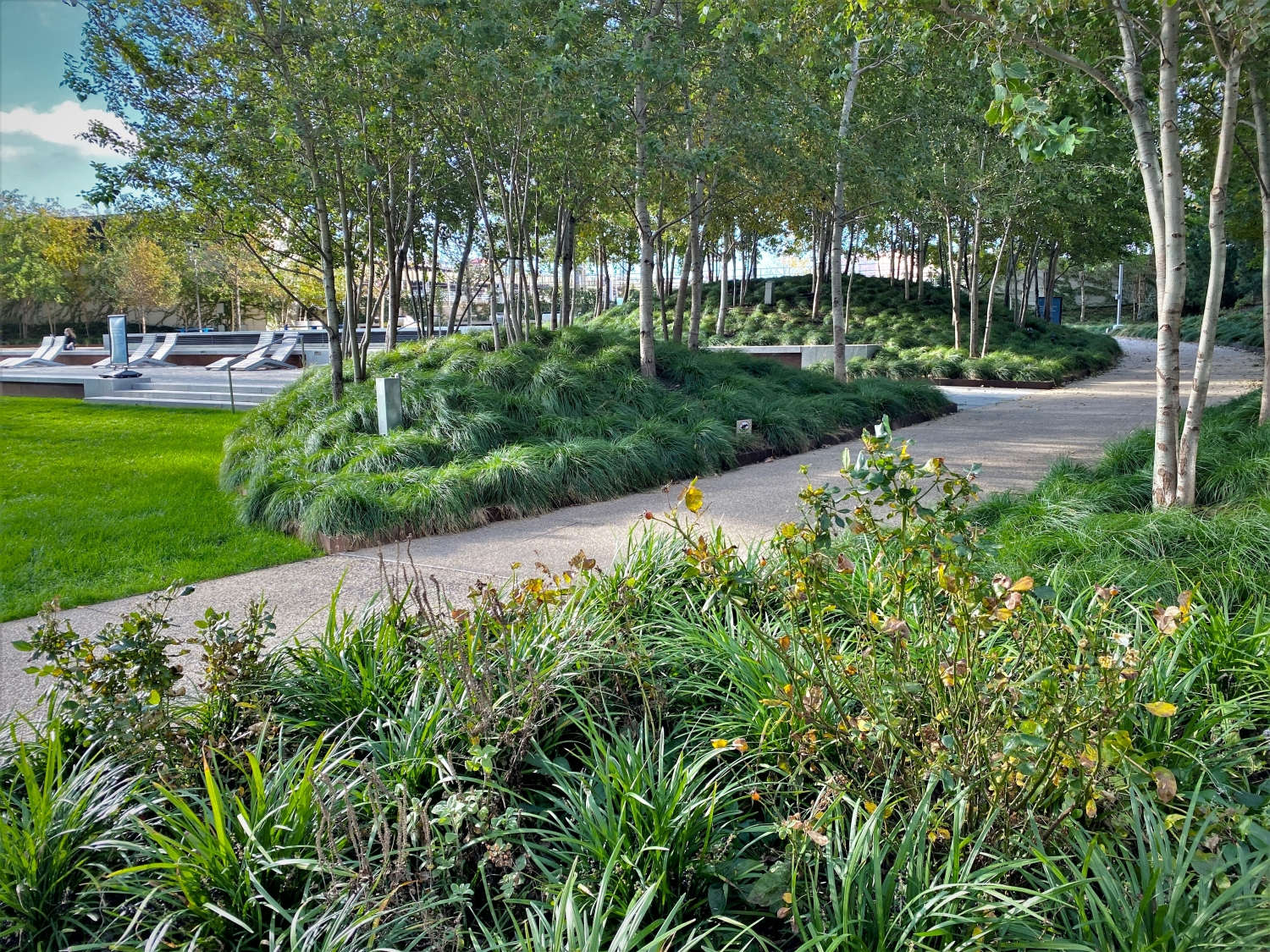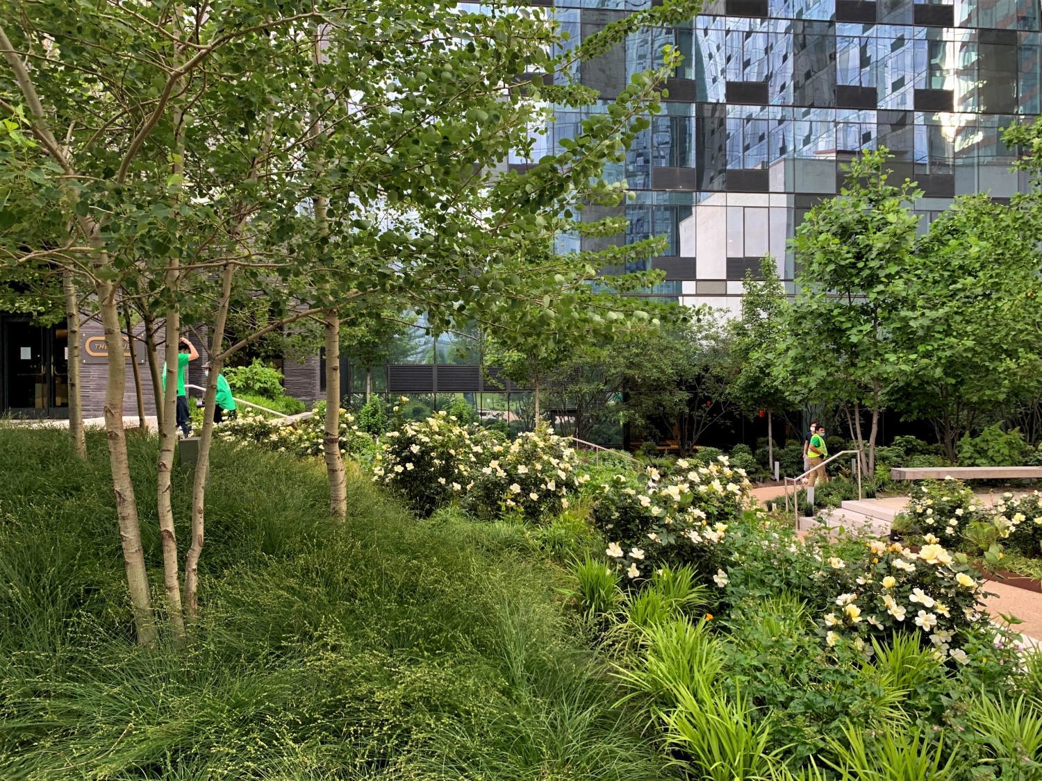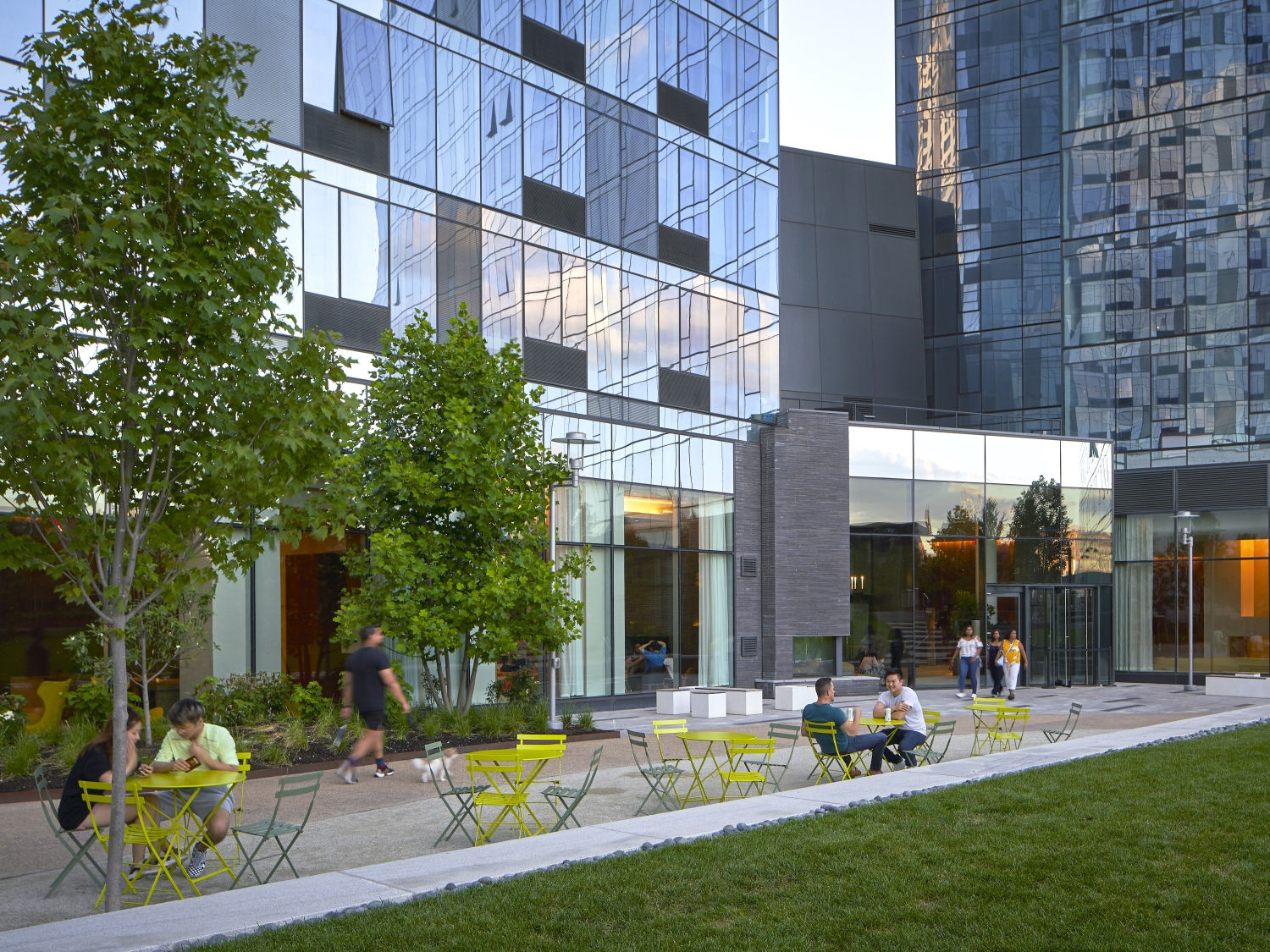 Framed by three 40 plus story towers, a 1 ½ acre common open space landscape emerges as the identity feature after which this mix-used residential development’s is named. Functioning like a historic town green, Jackson Park’s landscape is a community gathering center and residents’ social heart and oxygenating soul. Servicing more than 700 apartments, it offers a variety of popular passive and semi-active recreational amenities which are spatially organized around a large open lawn. The lawn’s central location is defined by a regionally based woodland landscape that permeates out from the buildings’ foundations. The woodland hosts a complimentary network of plant types and companion communities through which a network of garden walkways link building entries and access a collection of distinct activities spaces. Visual and functional clarity is achieved through a cohesive landscape character as the Park’s primary spatial structure. Adjacent to the vast and open LIRR rail corridor, the landscape’s scale, density, and critical mass buffers its transit and industrial context. References to the neighborhood’s industrial commercial heritage inspired the design of the park’s site elements and materials. Proximity to the East River and its original ecology informed the landscape’s plant communities to deepen connections with its environmental and urban development heritage.