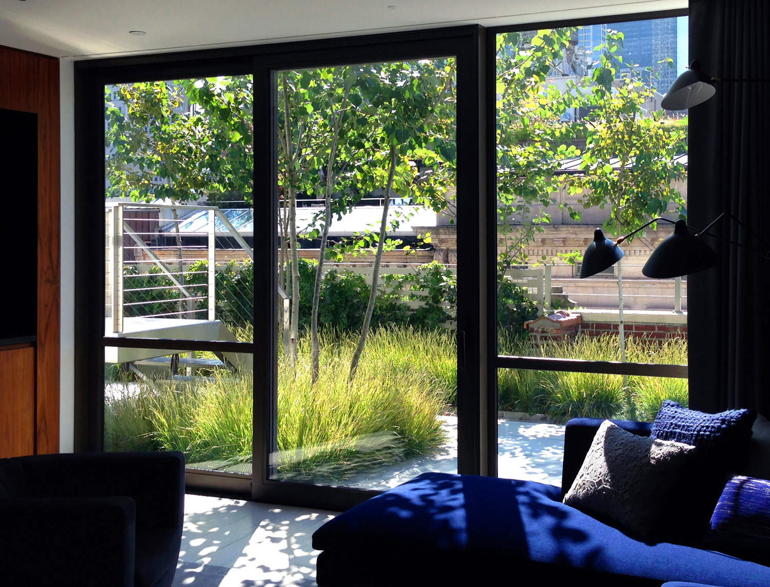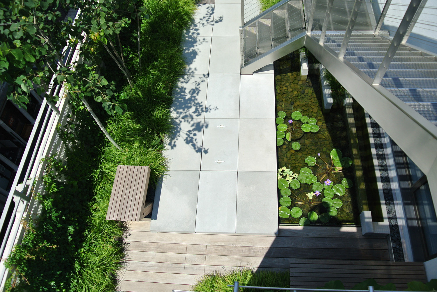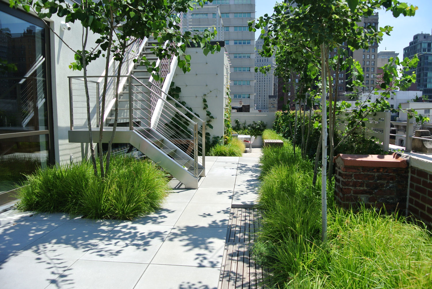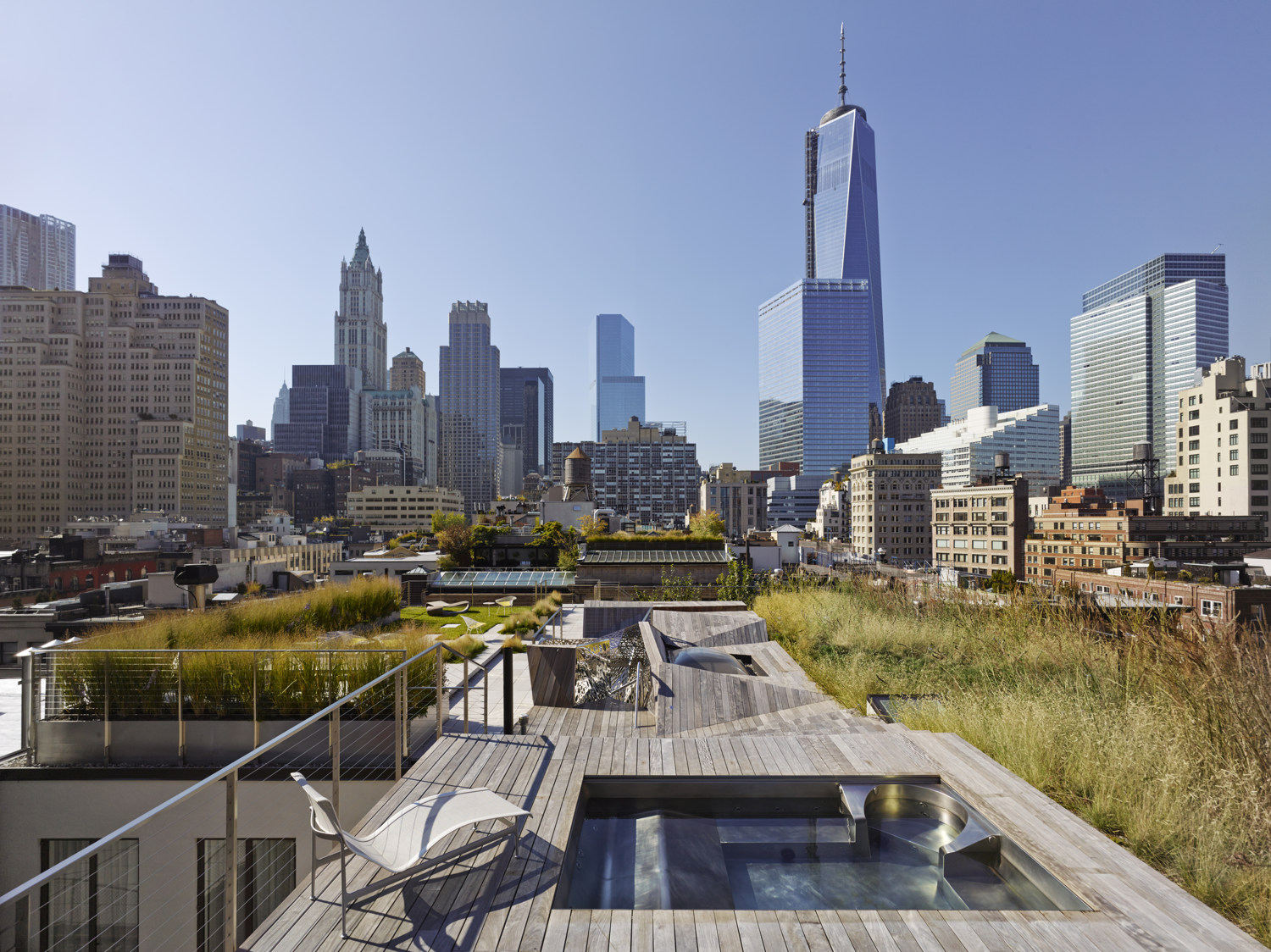 One of the most transformative interventions with this penthouse renovation included its seamless integration of its rooftop landscapes. Each of the penthouse’s contemporary living spaces features visual and physical connection to a variety of roof gardens. This comprehensive and ambitious single family rooftop landscape renovation presented great opportunities and challenges. A multi-faceted landscape design concept required innovative structural and mechanical improvements to the building’s late-nineteenth infrastructure. Its multi-level level and multi-purpose rooftop landscape was conceived and spatially organized within a complimentary mix of regionally based plant communities. Organized by three principal design interventions—modulated floor surfacing, topographic manipulations, and vertical espaliered gardens. These design elements were composed as seamless extensions of penthouse interiors to blur building and landscape junctions. The main terrace level features a grove of Aspen trees as a transitional garden element within a stepped garden path which connects a sunken dining terrace. A reflection pool is used as a central terrace feature to fuse interior and outdoor space. Swaths of meadow grasses accompany vine covered treillage that visually mask any evidence of the roof’s brick parapet boundaries. The melding of a variety of differently scaled plantings visually dominates while spatially defining each terrace garden. The rooftop landscape’s immersive qualities are an unexpected and mystical natural world experience that is a diametrically opposed counterpoint to lower Manhattan’s skyline.