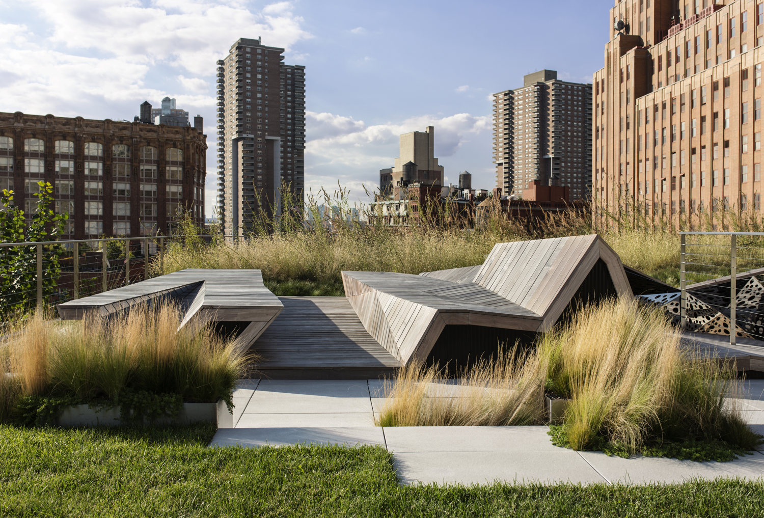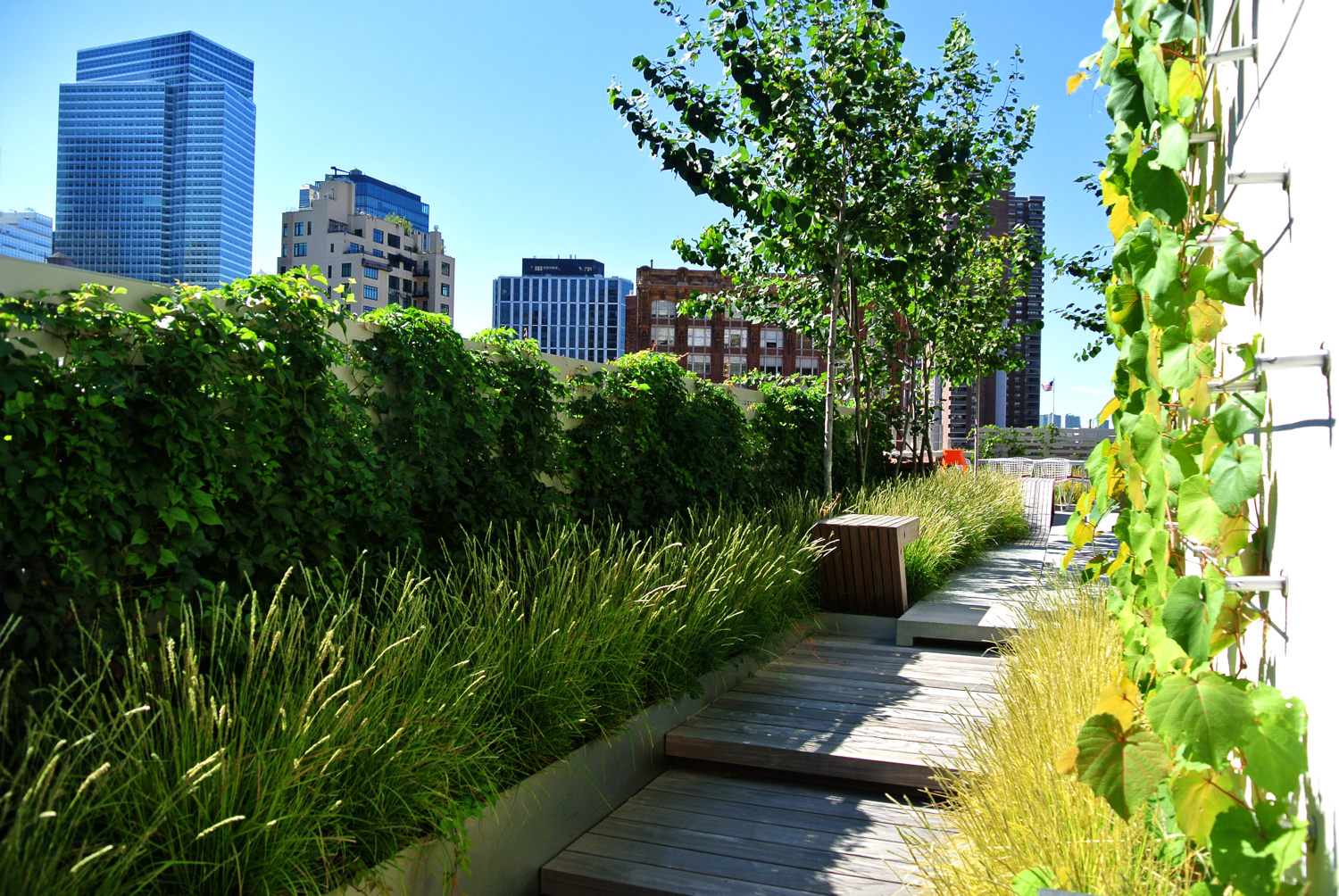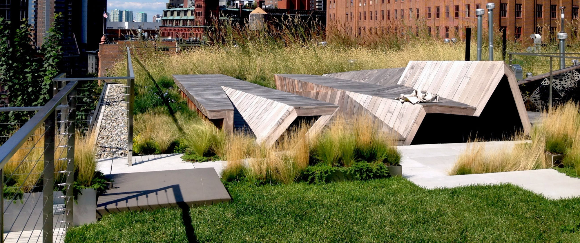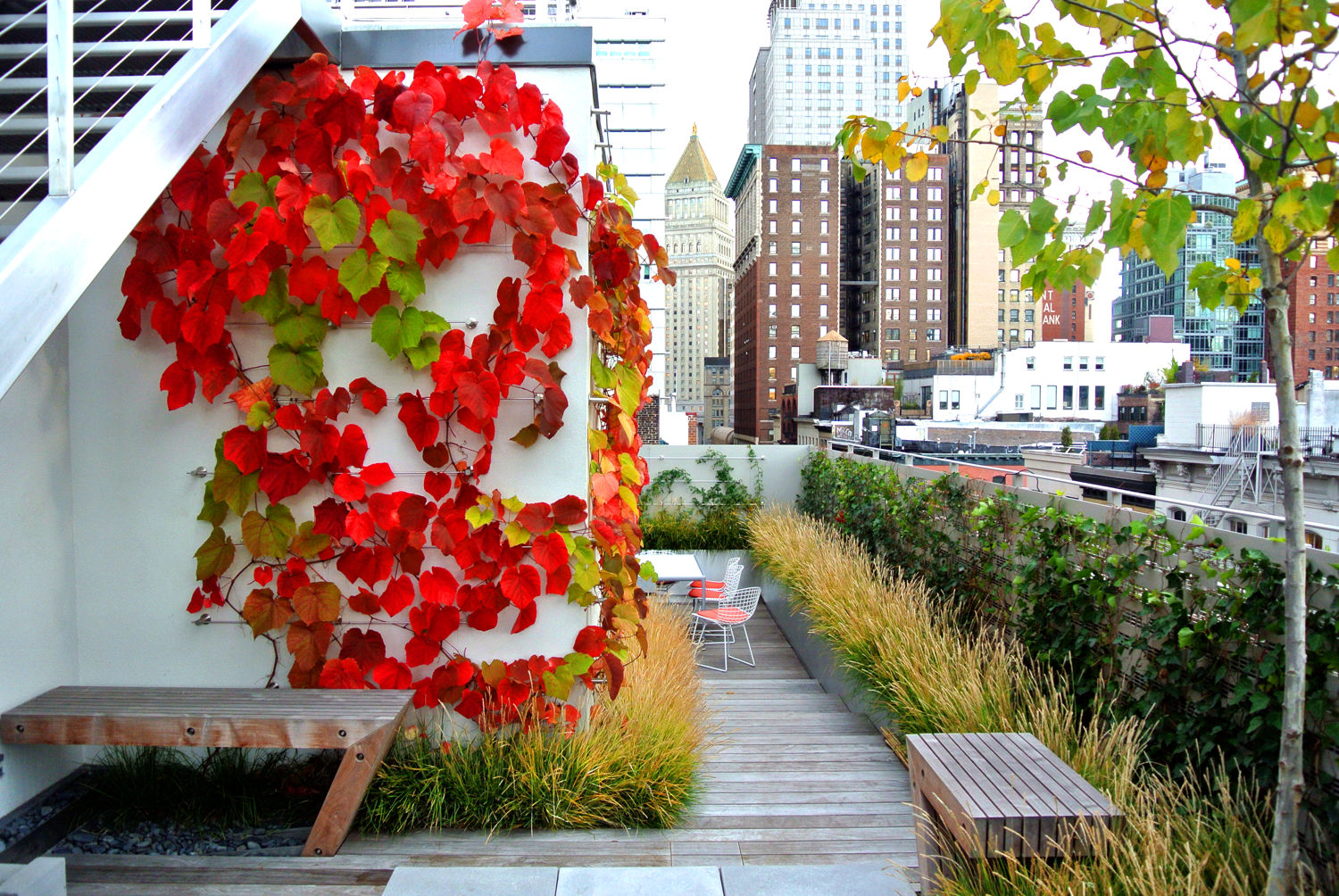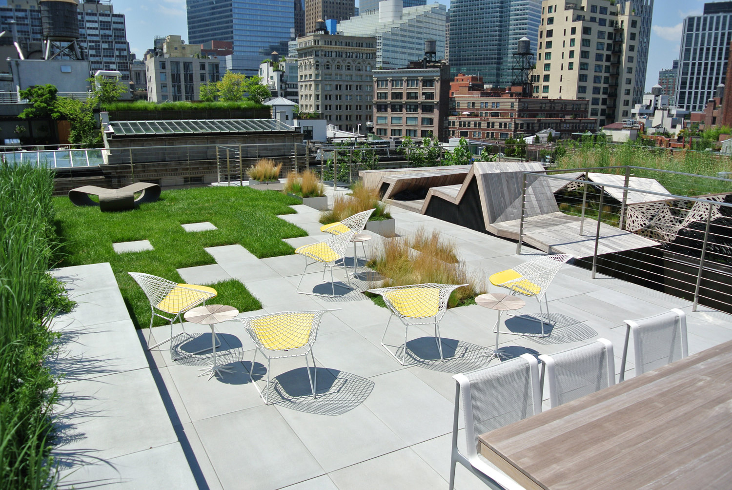 One of the most transformative interventions with this penthouse renovation included its seamless integration of its rooftop landscapes. Each of the penthouse’s contemporary living spaces features visual and physical connection to a variety of roof gardens. This comprehensive and ambitious single family rooftop landscape renovation presented great opportunities and challenges. A multi-faceted landscape design concept required innovative structural and mechanical improvements to the building’s late-nineteenth infrastructure. Its multi-level level and multi-purpose rooftop landscape was conceived and spatially organized within a complimentary mix of regionally based plant communities. Organized by three principal design interventions—modulated floor surfacing, topographic manipulations, and vertical espaliered gardens. These design elements were composed as seamless extensions of penthouse interiors to blur building and landscape junctions. The main terrace level features a grove of Aspen trees as a transitional garden element within a stepped garden path which connects a sunken dining terrace. A reflection pool is used as a central terrace feature to fuse interior and outdoor space. Swaths of meadow grasses accompany vine covered treillage that visually mask any evidence of the roof’s brick parapet boundaries. The melding of a variety of differently scaled plantings visually dominates while spatially defining each terrace garden. The rooftop landscape’s immersive qualities are an unexpected and mystical natural world experience that is a diametrically opposed counterpoint to lower Manhattan’s skyline.