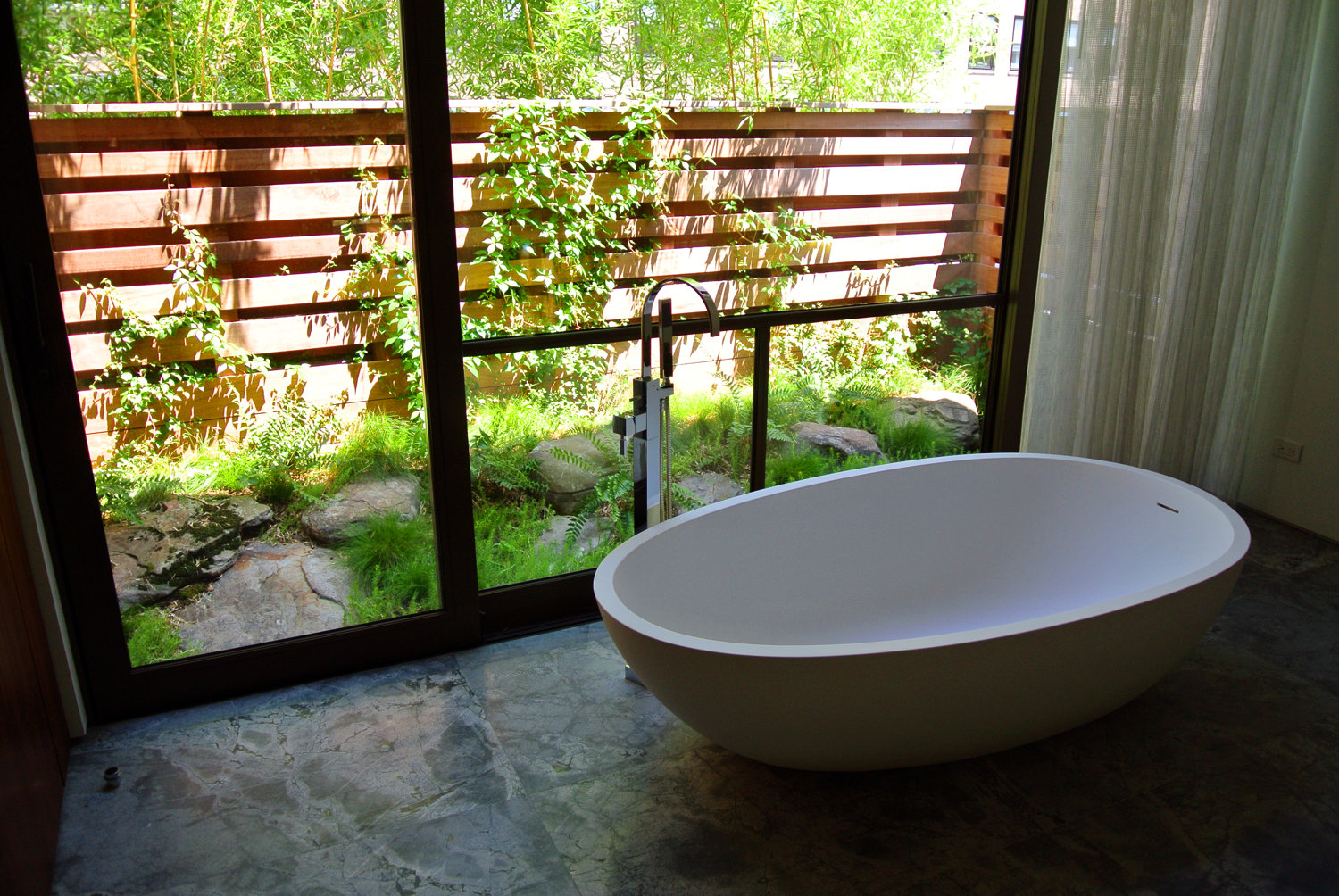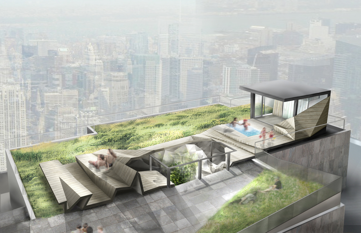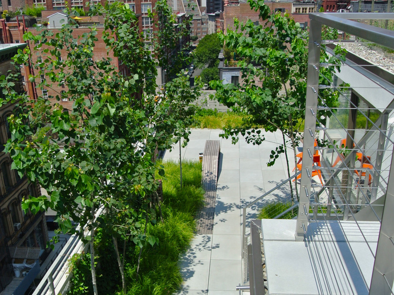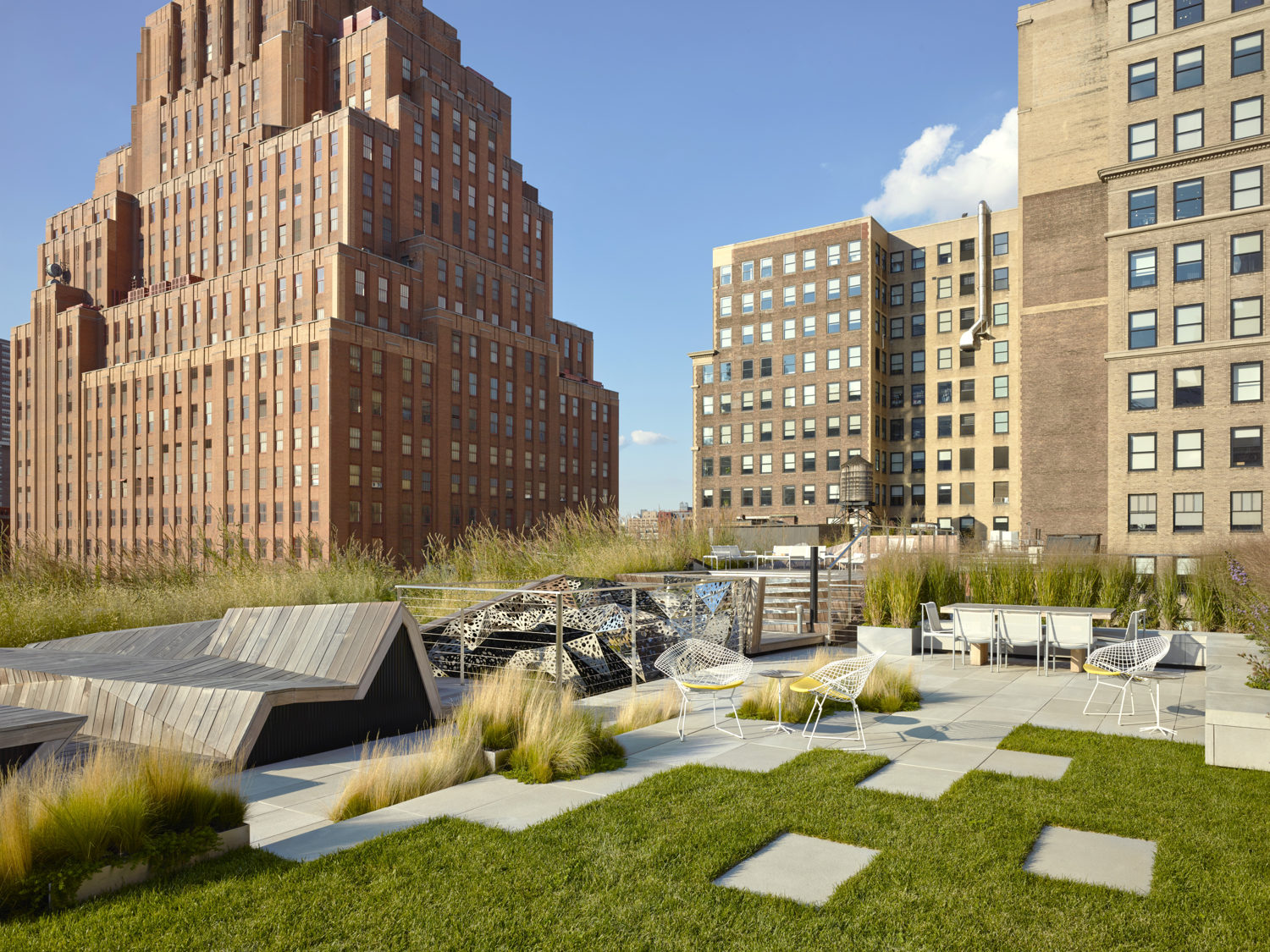 One of the most transformative interventions with this penthouse renovation included its seamless integration of its rooftop landscapes. Each of the penthouse’s contemporary living spaces features visual and physical connection to a variety of roof gardens. This comprehensive and ambitious single family rooftop landscape renovation presented great opportunities and challenges. A multi-faceted landscape design concept required innovative structural and mechanical improvements to the building’s late-nineteenth infrastructure. Its multi-level level and multi-purpose rooftop landscape was conceived and spatially organized within a complimentary mix of regionally based plant communities. Organized by three principal design interventions—modulated floor surfacing, topographic manipulations, and vertical espaliered gardens. These design elements were composed as seamless extensions of penthouse interiors to blur building and landscape junctions. The main terrace level features a grove of Aspen trees as a transitional garden element within a stepped garden path which connects a sunken dining terrace. A reflection pool is used as a central terrace feature to fuse interior and outdoor space. Swaths of meadow grasses accompany vine covered treillage that visually mask any evidence of the roof’s brick parapet boundaries. The melding of a variety of differently scaled plantings visually dominates while spatially defining each terrace garden. The rooftop landscape’s immersive qualities are an unexpected and mystical natural world experience that is a diametrically opposed counterpoint to lower Manhattan’s skyline.