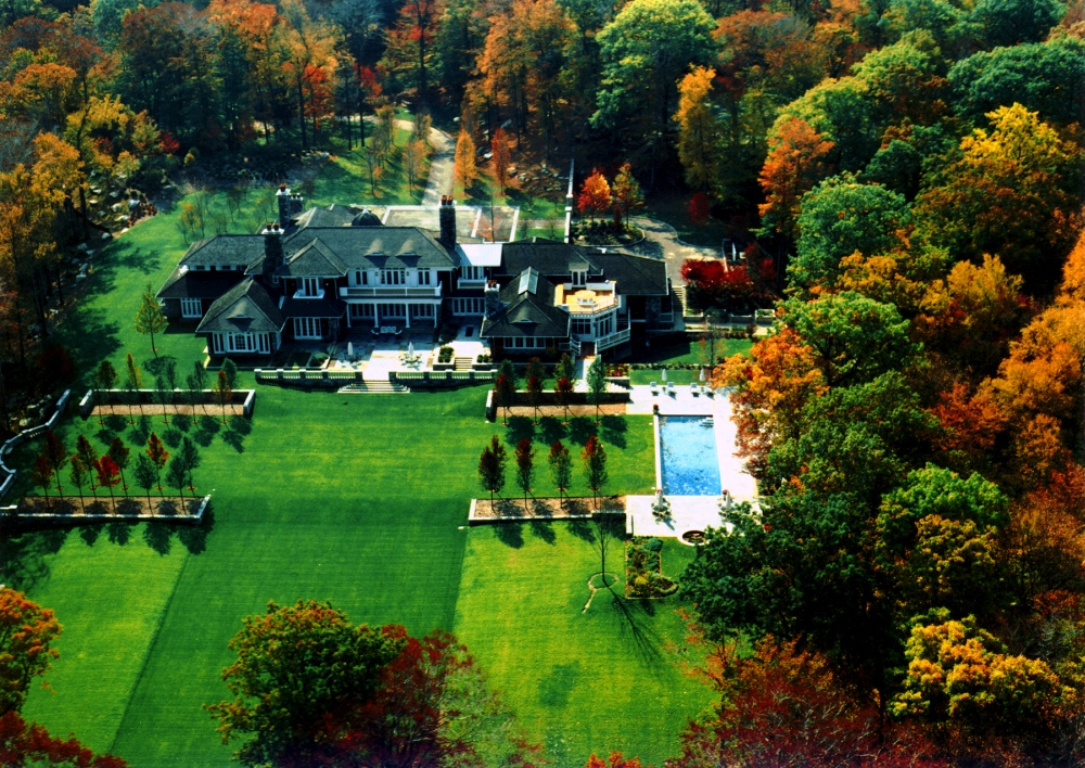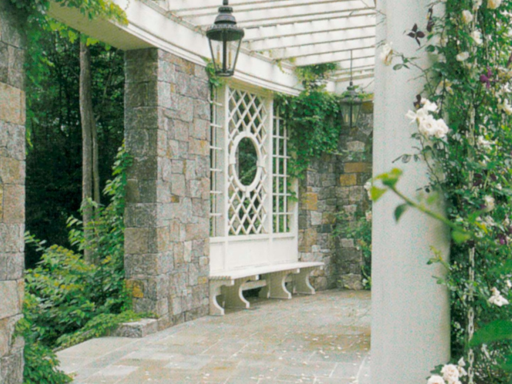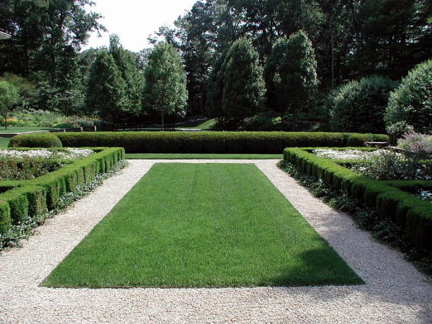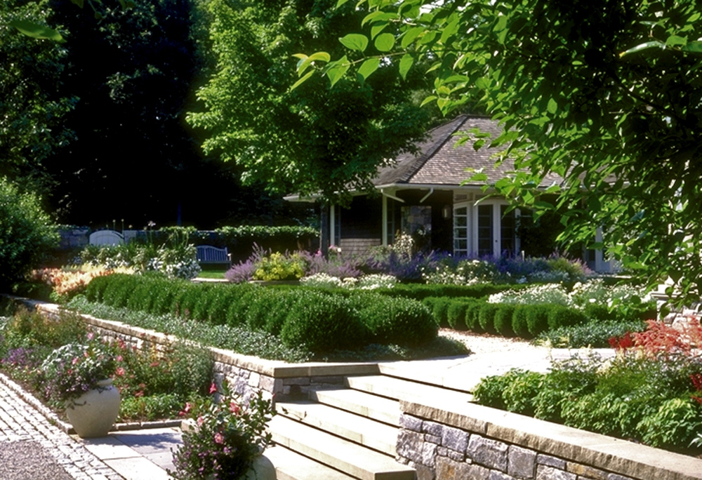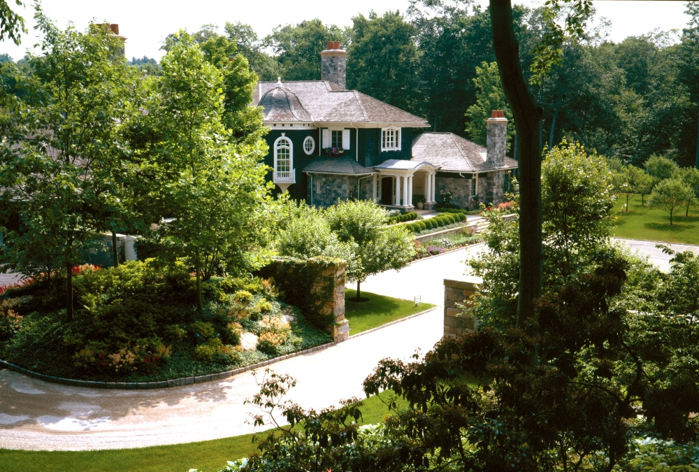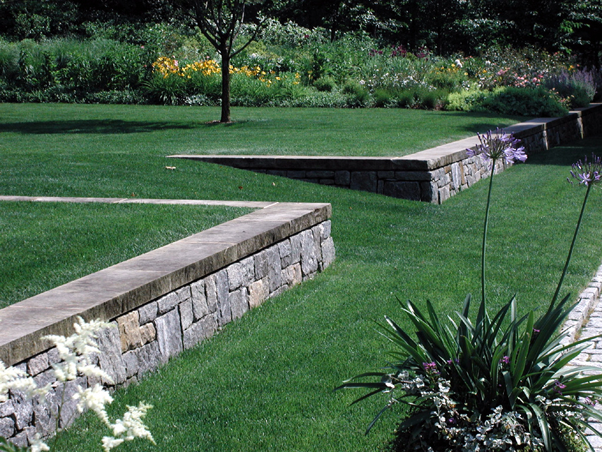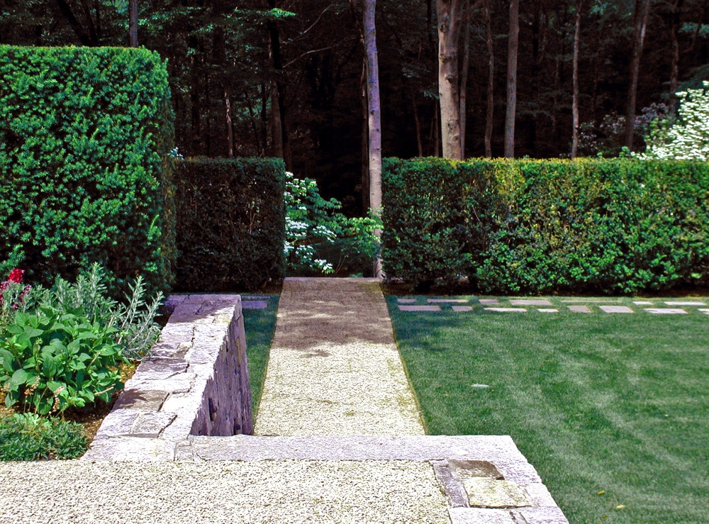 A network of locally harvested fieldstone walls was organized to establish a landscape armature to spatially define various distinct outdoor rooms within the expansiveness of the open landscape. The garden architecture was used as building extensions inserted into the woodland to anchor the building's broad presence to its landscape setting. Both freestanding and retaining stone walls reference Connecticut's historic and familiar vernacular countryside. Their landscape design integration tamed the site's challenging and varying topographic conditions into a sequence of terraces, lawn panels, and sloped gardens. Ballasted stone retaining wall created overlooks that brought the house's domestic landscape close to the woodland edges, dramatizing this junction through its contrasting characteristics and differences between the tame and the wild landscapes. Garden rooms and landscape features were spatially organized within a hierarchical order of these axial principles. Within the large woodland scar, orthogonal arrangements of landscape typologies – bosques, allées, orchards, and lawn parterres were introduced as a transitional landscape framework to blur an abrupt junction with the surrounding woodland's majestic scale. This fusion of the old meeting the new created an instantaneous timeless landscape design composition.