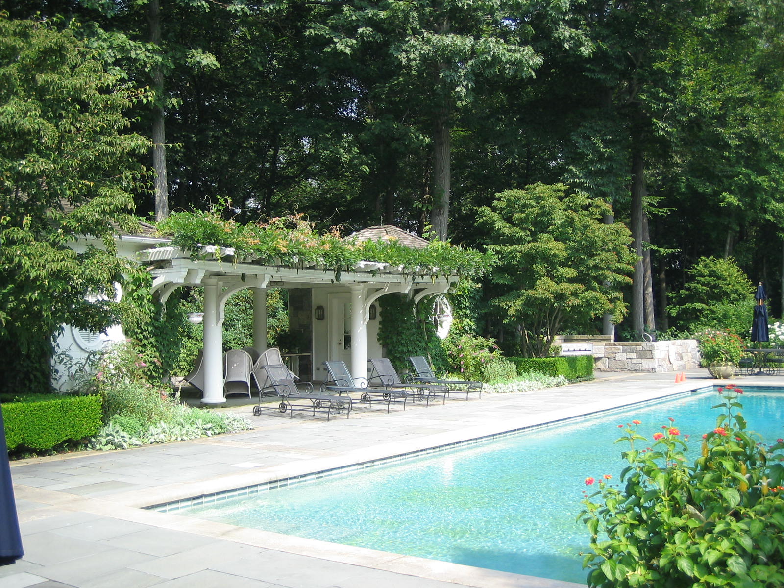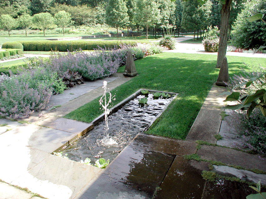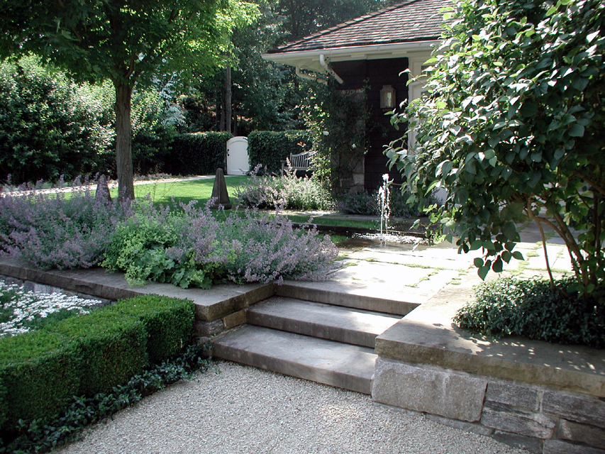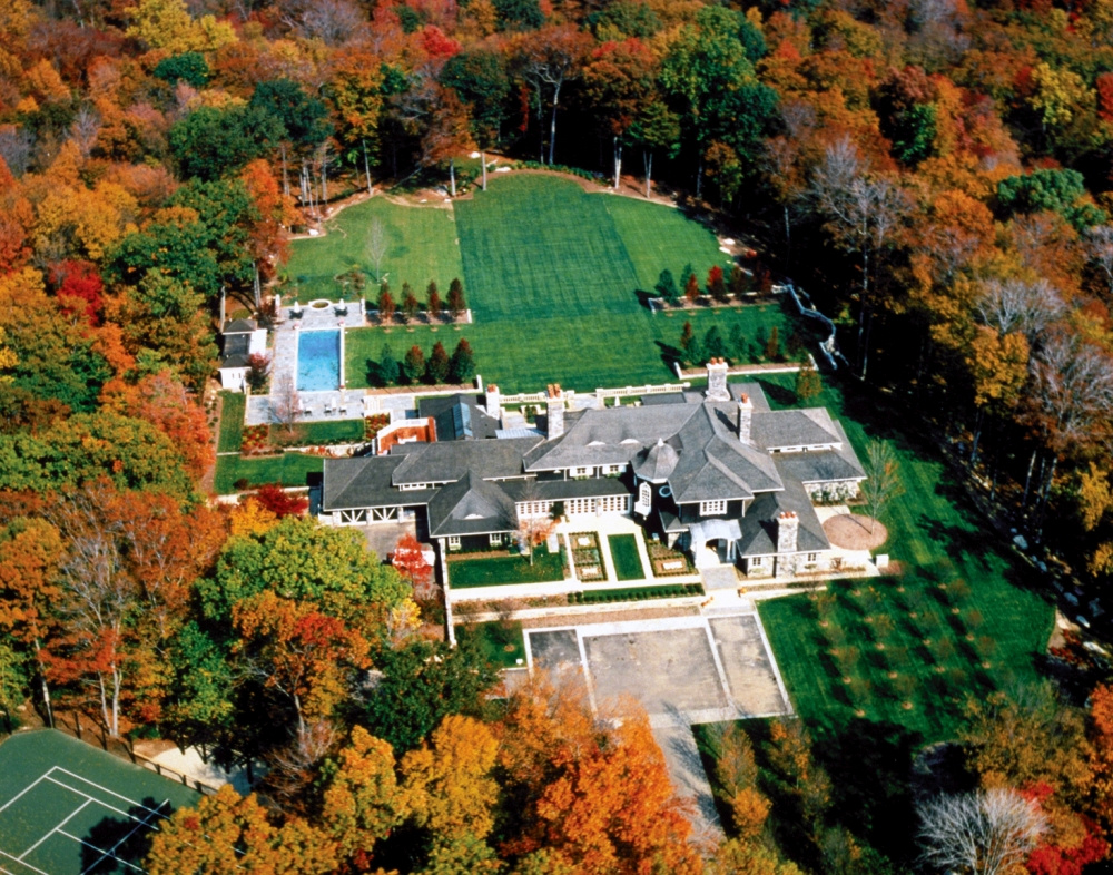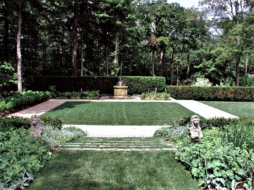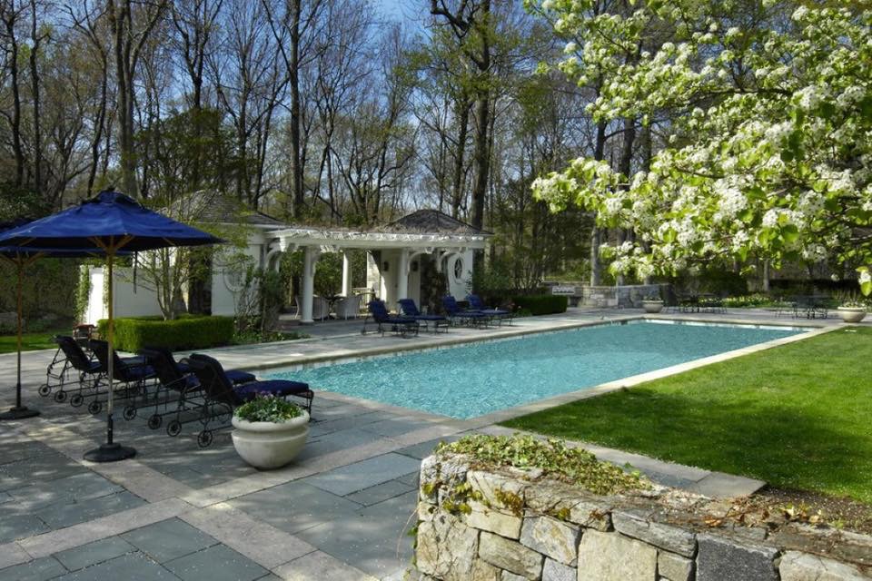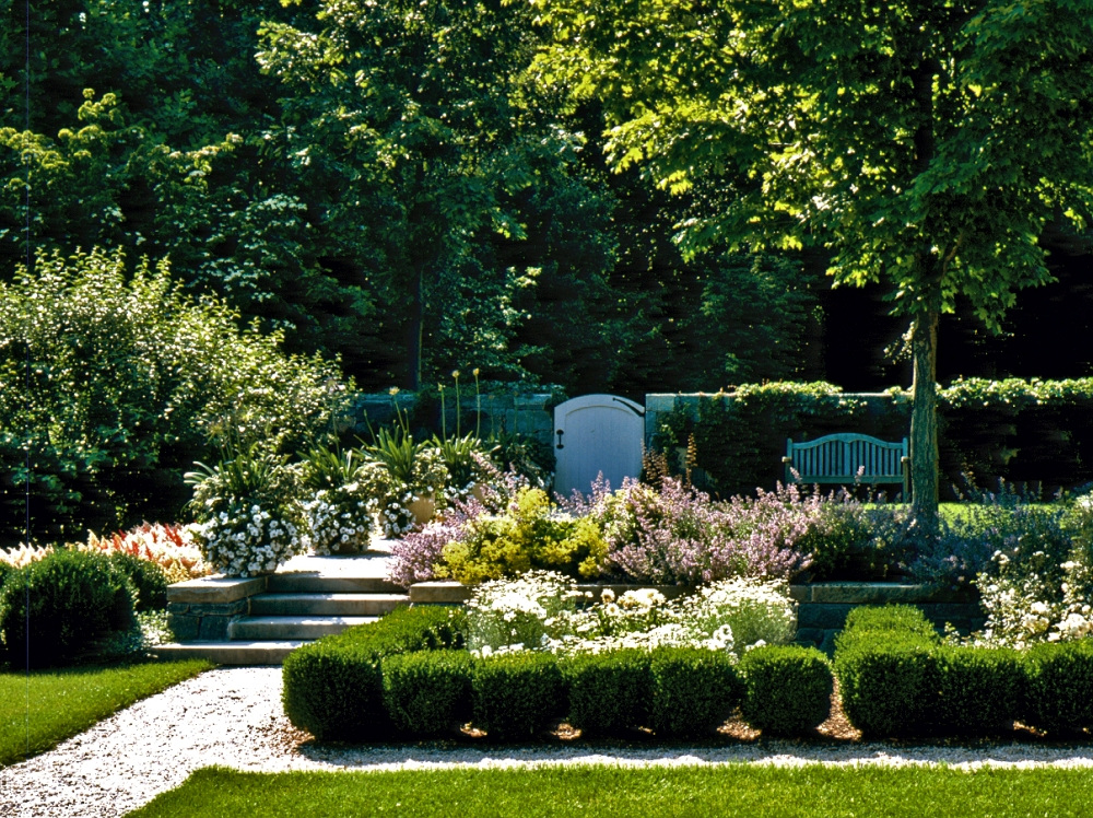 A network of locally harvested fieldstone walls was organized to establish a landscape armature to spatially define various distinct outdoor rooms within the expansiveness of the open landscape. The garden architecture was used as building extensions inserted into the woodland to anchor the building's broad presence to its landscape setting. Both freestanding and retaining stone walls reference Connecticut's historic and familiar vernacular countryside. Their landscape design integration tamed the site's challenging and varying topographic conditions into a sequence of terraces, lawn panels, and sloped gardens. Ballasted stone retaining wall created overlooks that brought the house's domestic landscape close to the woodland edges, dramatizing this junction through its contrasting characteristics and differences between the tame and the wild landscapes. Garden rooms and landscape features were spatially organized within a hierarchical order of these axial principles. Within the large woodland scar, orthogonal arrangements of landscape typologies – bosques, allées, orchards, and lawn parterres were introduced as a transitional landscape framework to blur an abrupt junction with the surrounding woodland's majestic scale. This fusion of the old meeting the new created an instantaneous timeless landscape design composition.