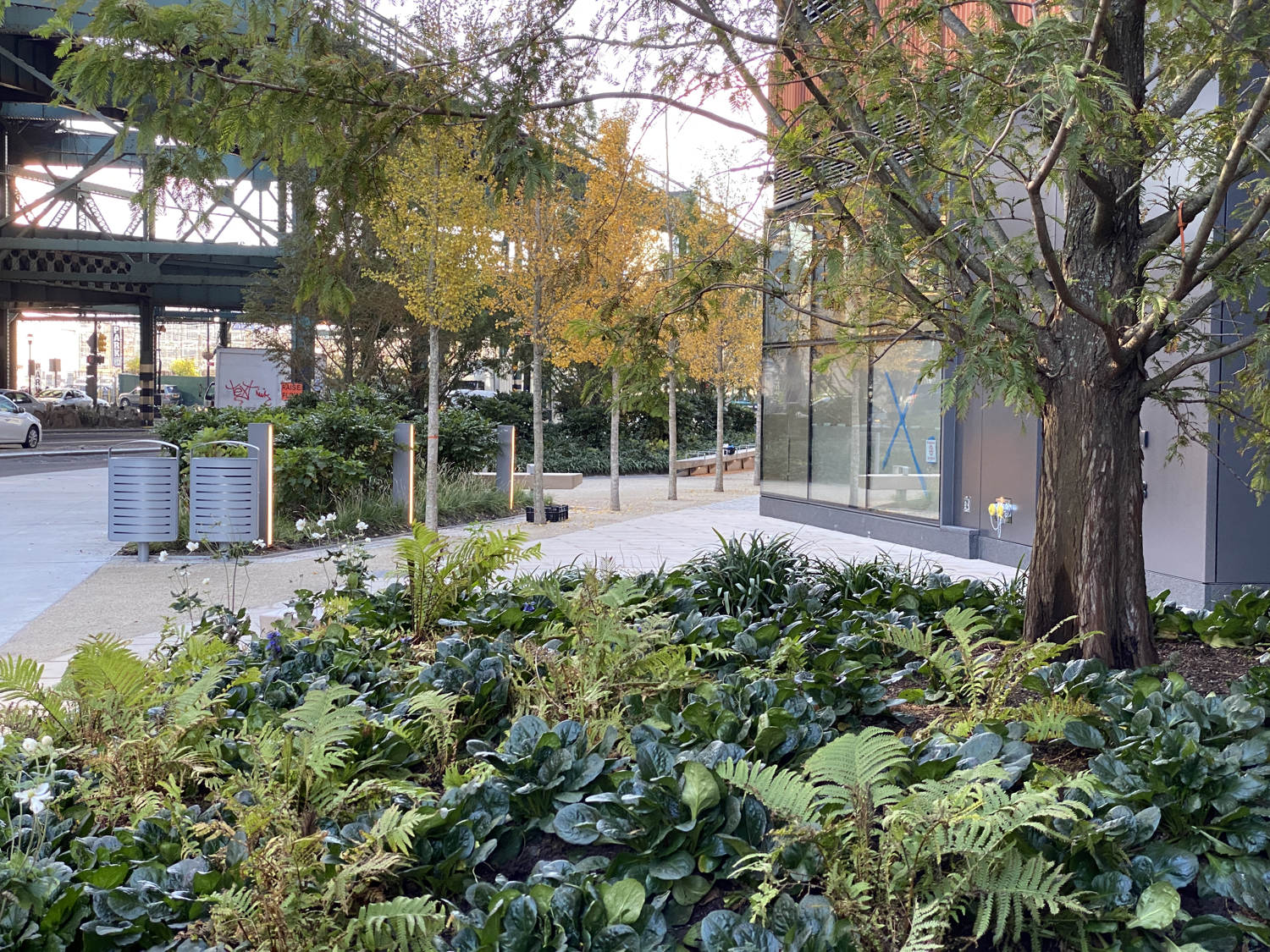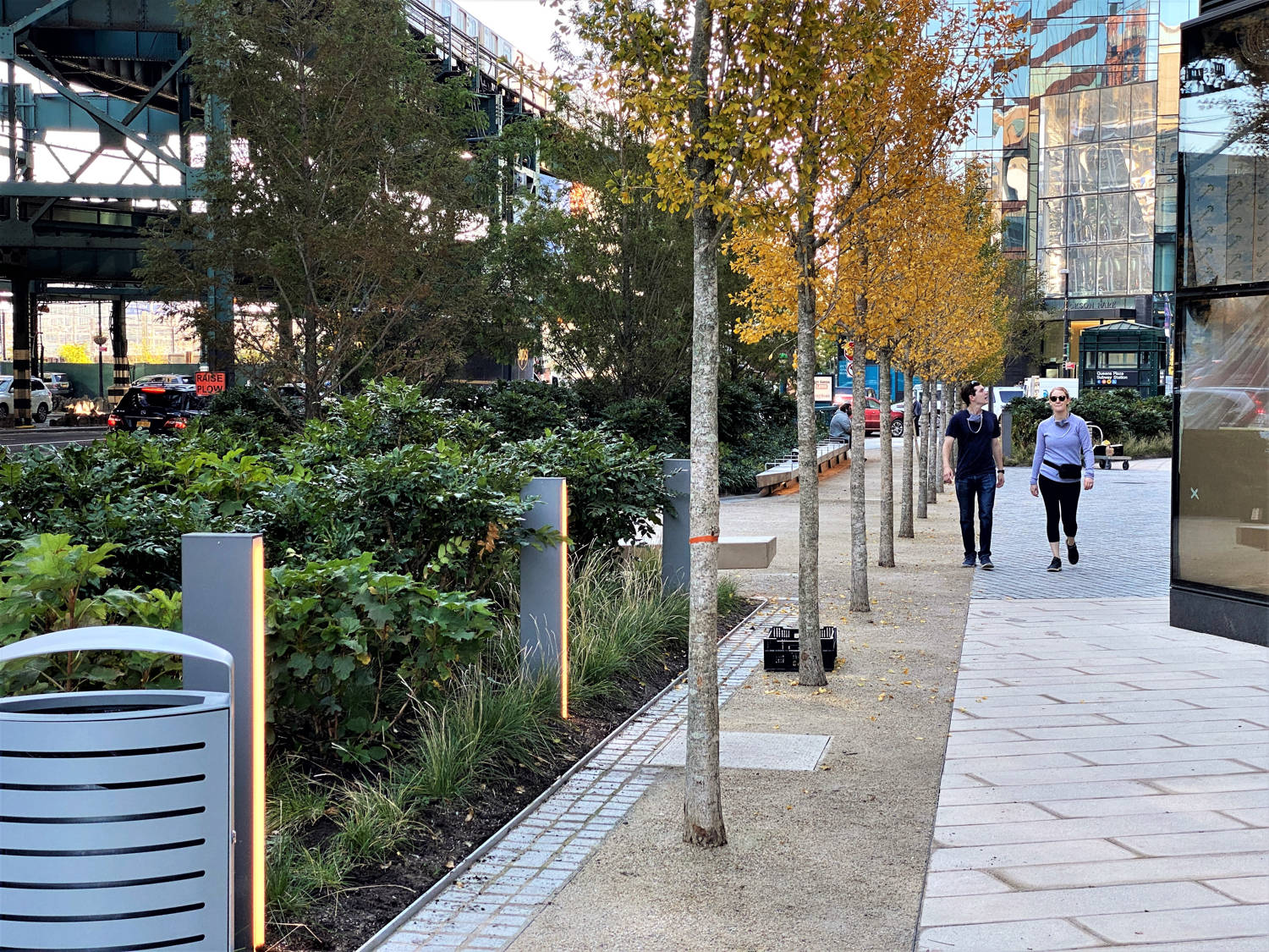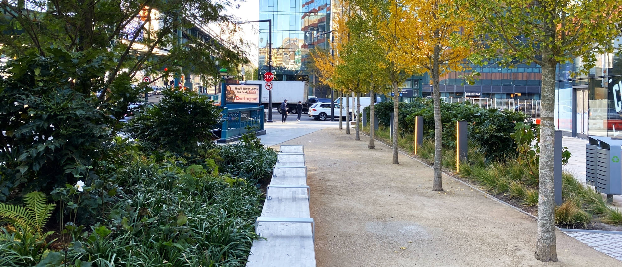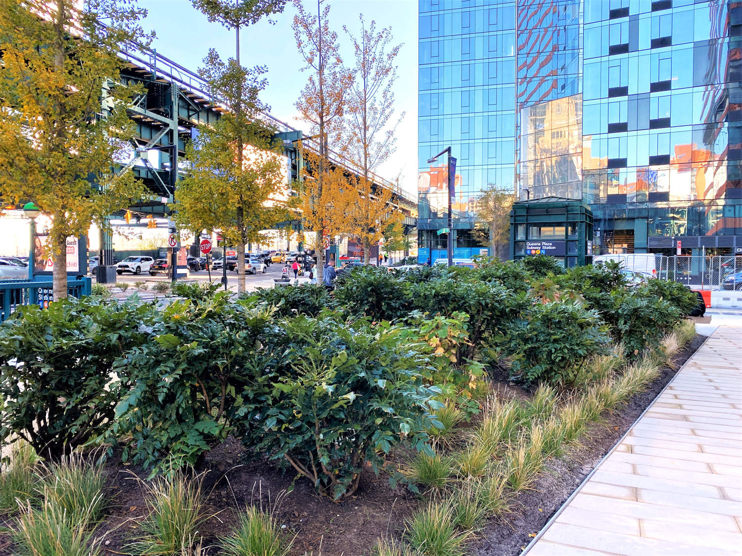 Formerly an open and undeveloped light industrial site, an opportunity for public space expansion and revitalization became and identity provoking part of a dual commercial tower development. The site’s wedge shape “left-over” space adjoins multi-laned streets and Queens elevated and noisy subway trestle. The plaza design prioritizes safe pedestrian movement by using existing barriers and its limited entry points to direct safe foot traffic. Large, mounded planting zones as vegetative boundaries create visual clarity for these “desire-line” routes to direct movement away from possible vehicular traffic crossings. Positioned along the streets and trestle edges, towering groves of Metasequoia trees with their seasonally robust under plantings attenuate buffer the neighboring noisy transit activity. A mitigating inward focus emerges to initiate social gathering and community engagement. A single row of ‘Autumn Gold’ Ginkgo trees distinctly register against Metasequoia forest as trail markers to further direct movement through the space. Places to congregate and meet within a spatial landscape context demonstrates the transformative value of using nature’s resources to create a neighborhood haven and memorable public space destination.