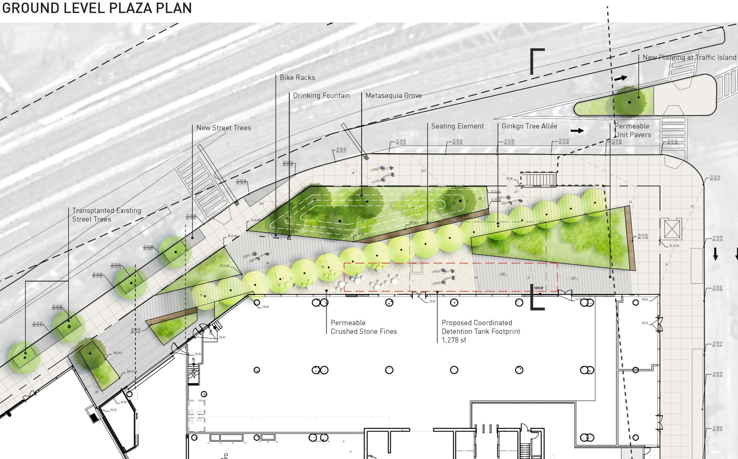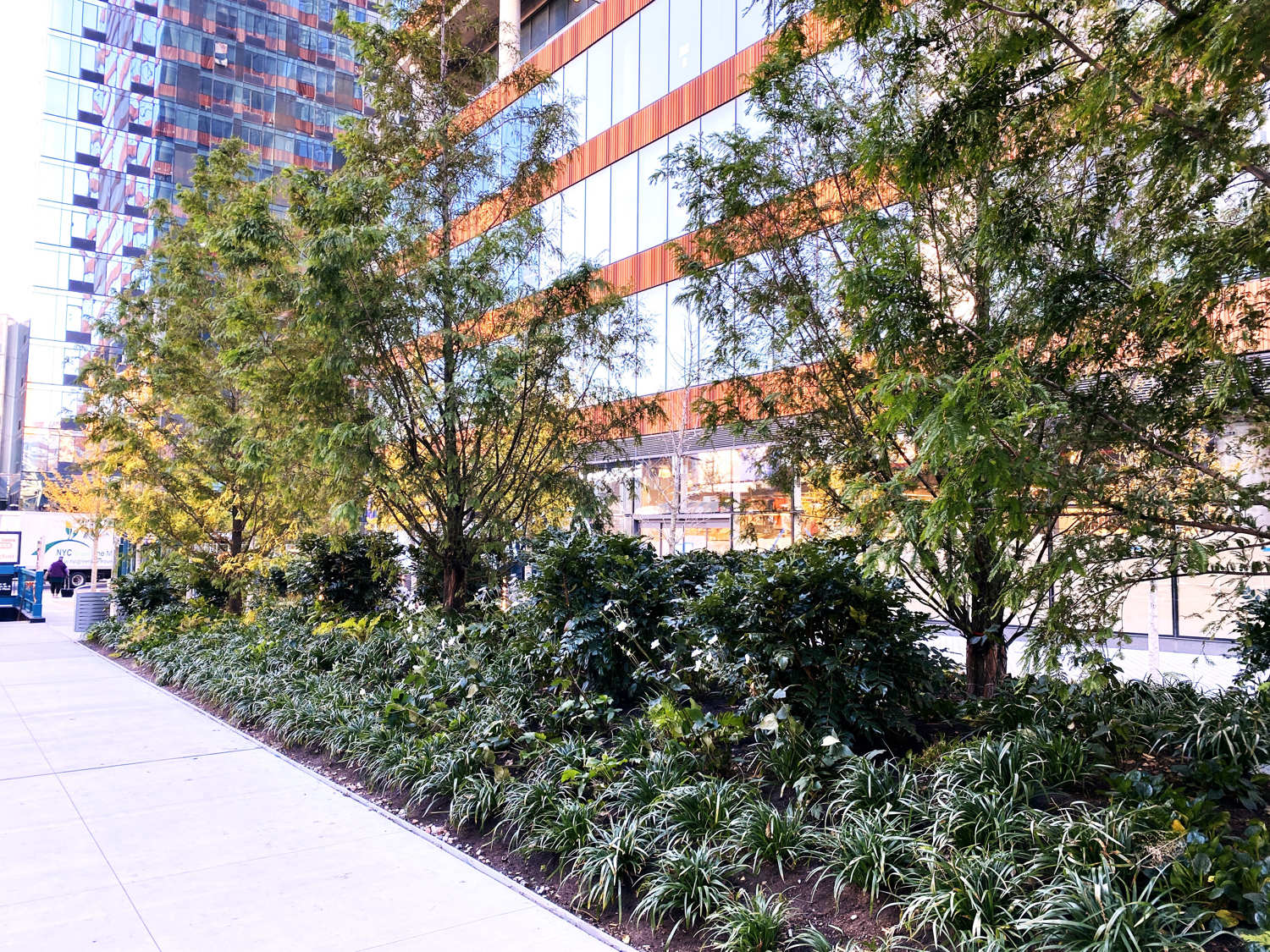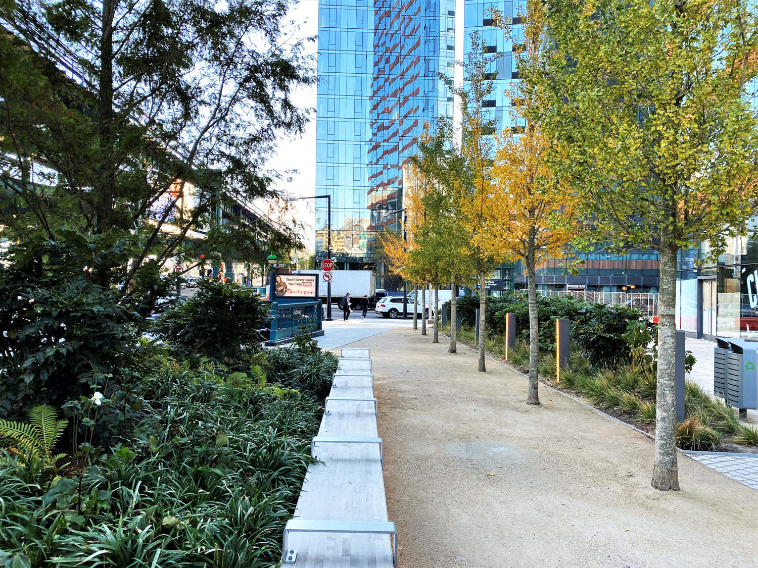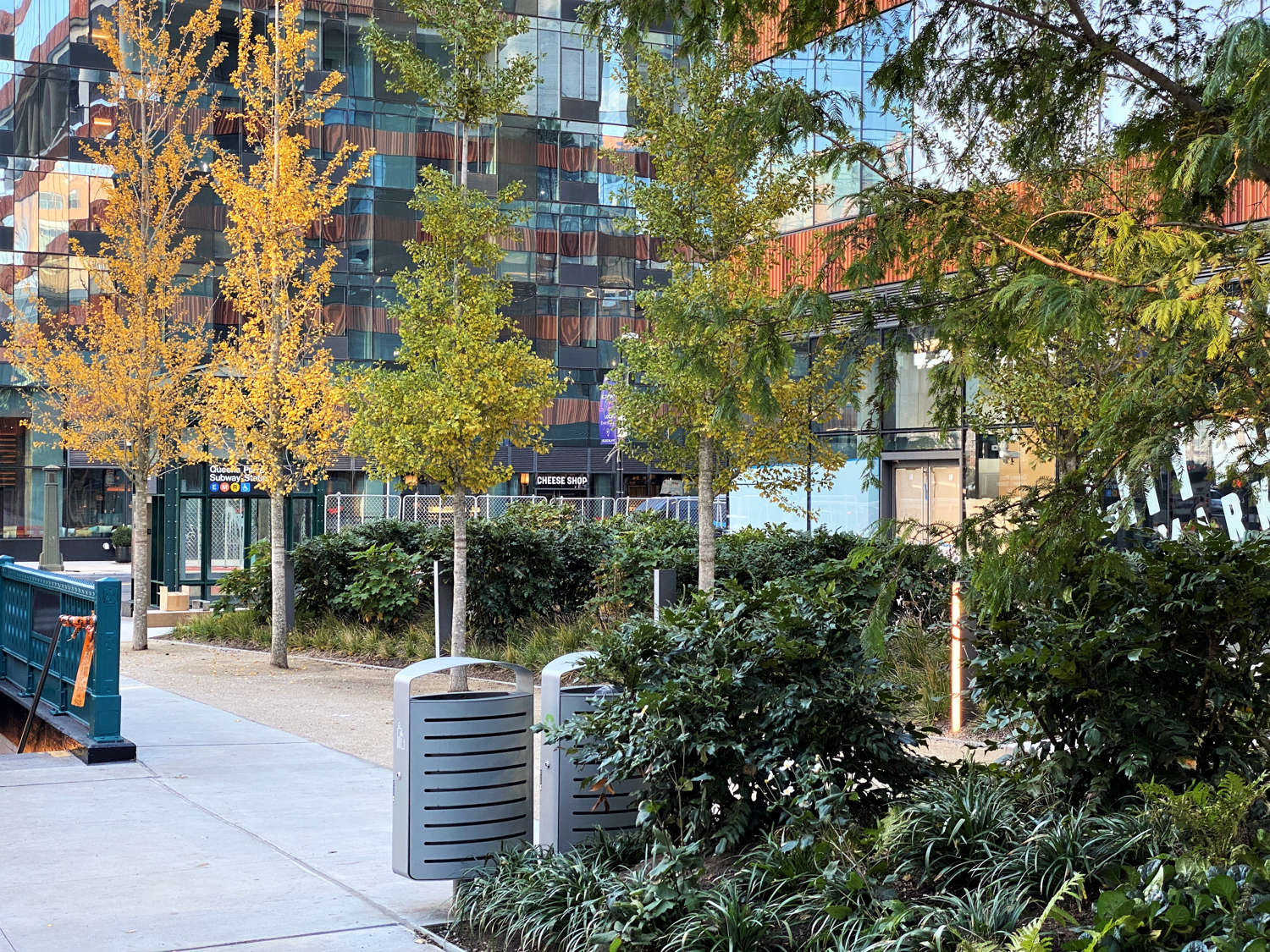 Formerly an open and undeveloped light industrial site, an opportunity for public space expansion and revitalization became and identity provoking part of a dual commercial tower development. The site’s wedge shape “left-over” space adjoins multi-laned streets and Queens elevated and noisy subway trestle. The plaza design prioritizes safe pedestrian movement by using existing barriers and its limited entry points to direct safe foot traffic. Large, mounded planting zones as vegetative boundaries create visual clarity for these “desire-line” routes to direct movement away from possible vehicular traffic crossings. Positioned along the streets and trestle edges, towering groves of Metasequoia trees with their seasonally robust under plantings attenuate buffer the neighboring noisy transit activity. A mitigating inward focus emerges to initiate social gathering and community engagement. A single row of ‘Autumn Gold’ Ginkgo trees distinctly register against Metasequoia forest as trail markers to further direct movement through the space. Places to congregate and meet within a spatial landscape context demonstrates the transformative value of using nature’s resources to create a neighborhood haven and memorable public space destination.