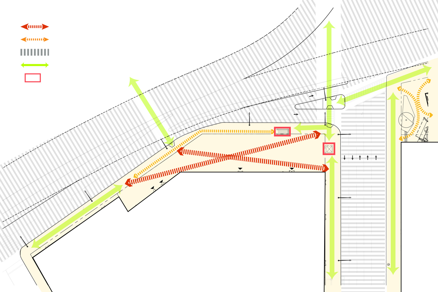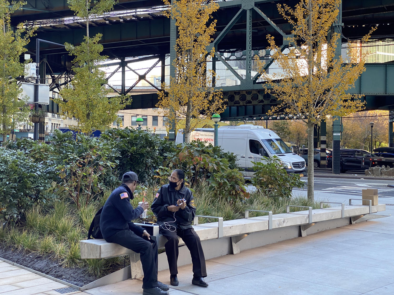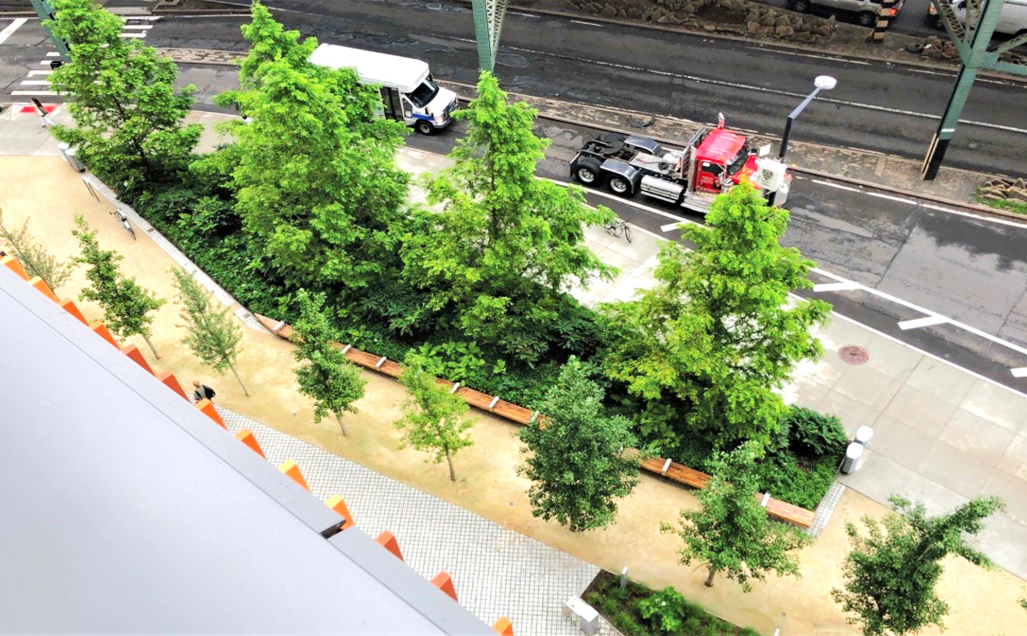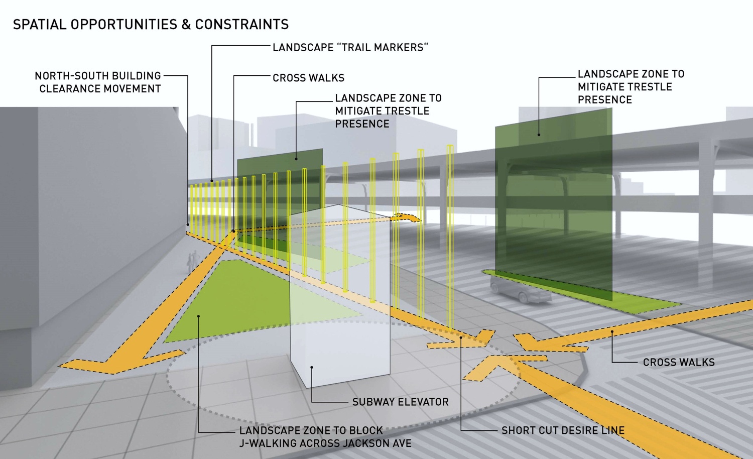 Formerly an open and undeveloped light industrial site, an opportunity for public space expansion and revitalization became and identity provoking part of a dual commercial tower development. The site’s wedge shape “left-over” space adjoins multi-laned streets and Queens elevated and noisy subway trestle. The plaza design prioritizes safe pedestrian movement by using existing barriers and its limited entry points to direct safe foot traffic. Large, mounded planting zones as vegetative boundaries create visual clarity for these “desire-line” routes to direct movement away from possible vehicular traffic crossings. Positioned along the streets and trestle edges, towering groves of Metasequoia trees with their seasonally robust under plantings attenuate buffer the neighboring noisy transit activity. A mitigating inward focus emerges to initiate social gathering and community engagement. A single row of ‘Autumn Gold’ Ginkgo trees distinctly register against Metasequoia forest as trail markers to further direct movement through the space. Places to congregate and meet within a spatial landscape context demonstrates the transformative value of using nature’s resources to create a neighborhood haven and memorable public space destination.