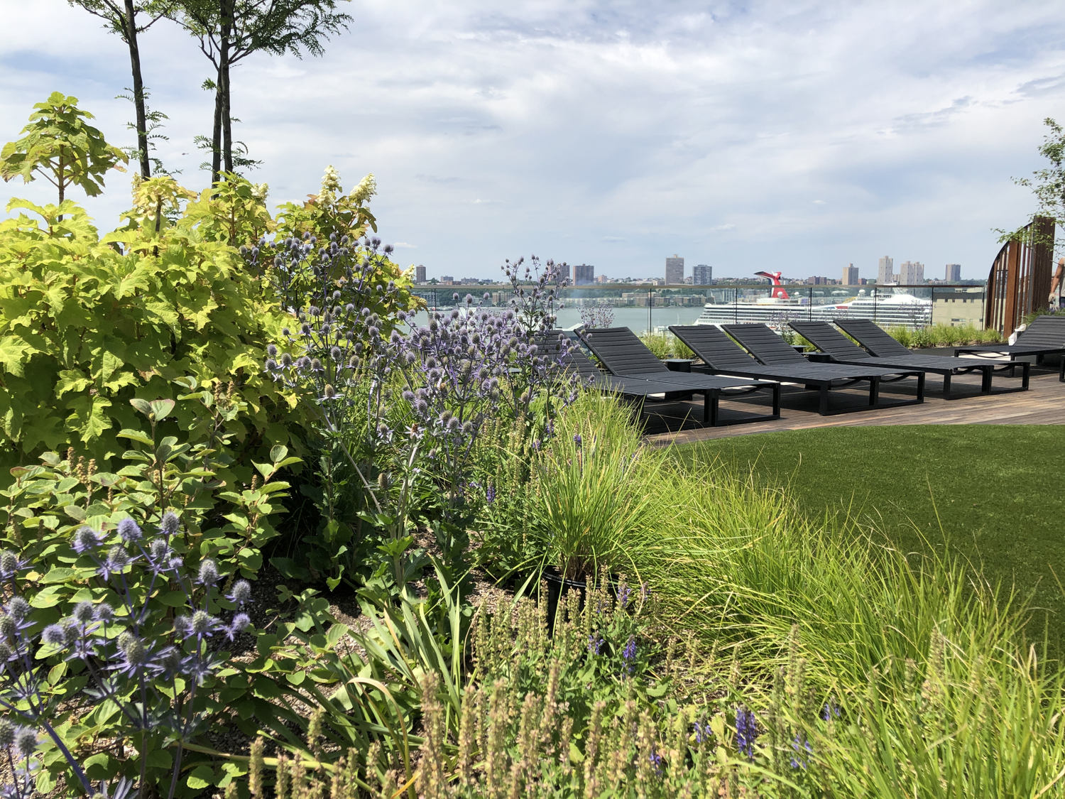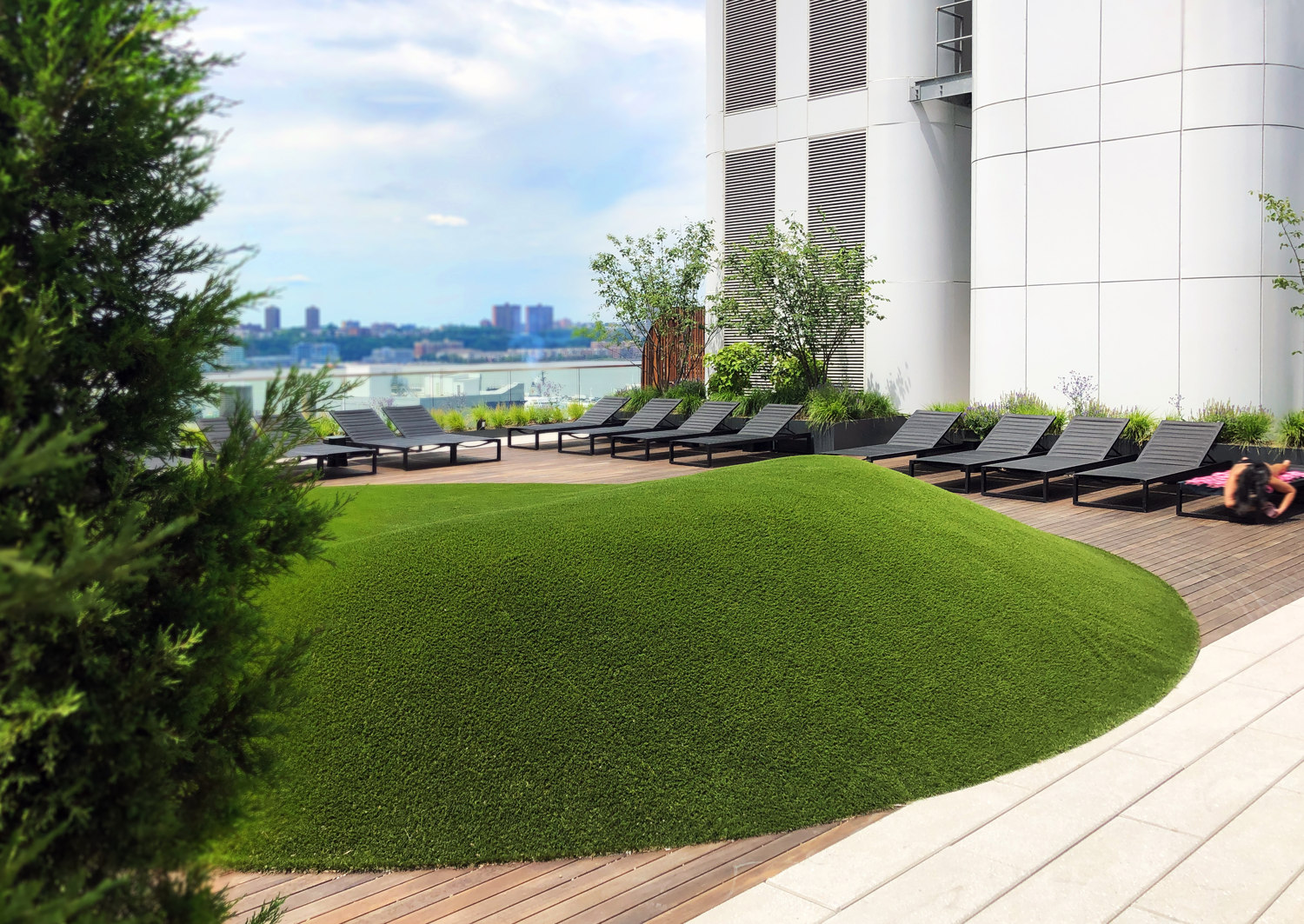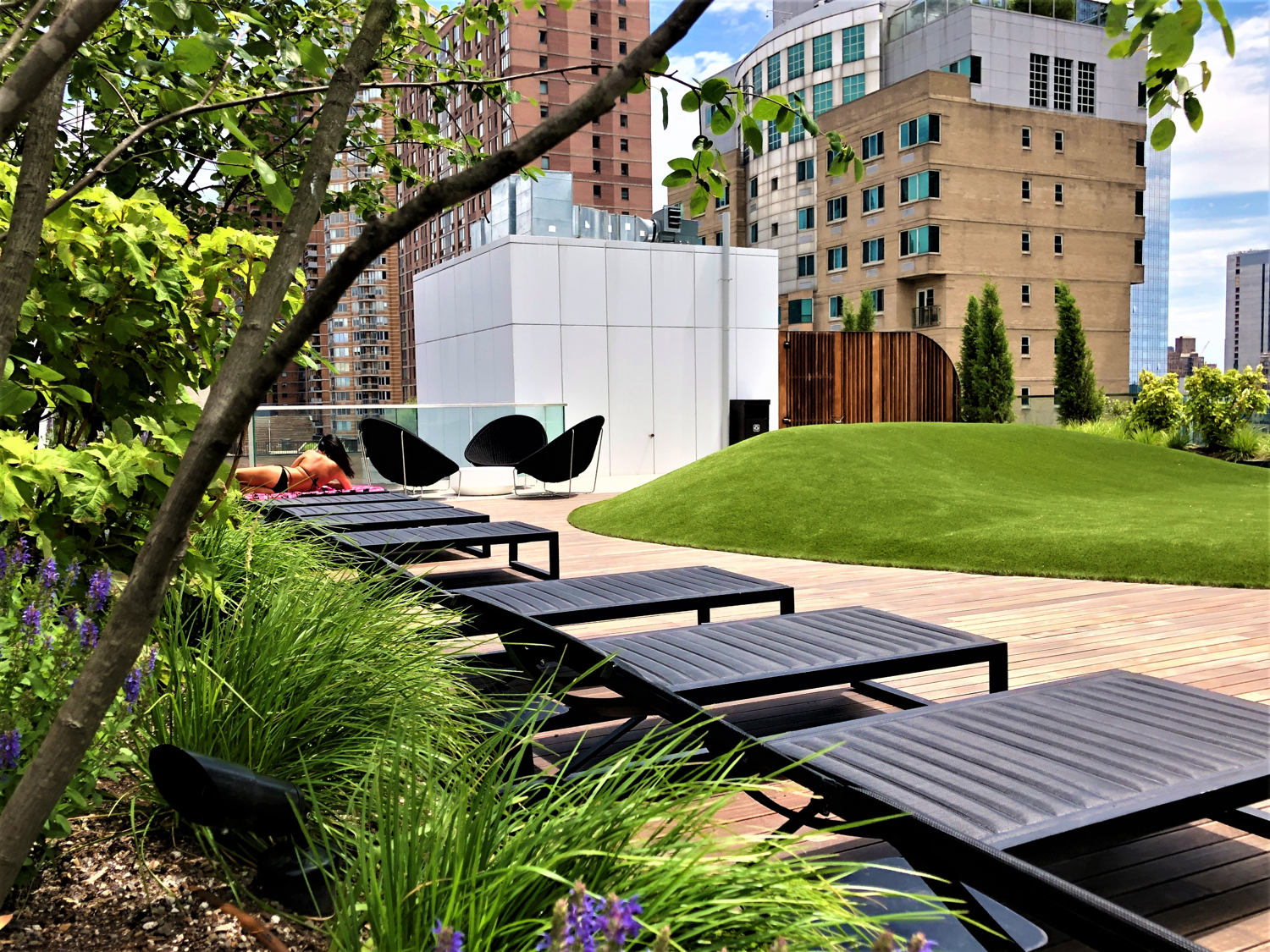 A rooftop sun terrace showcases awe inspiring Hudson River views. Summer flowering wildflowers and shrubs define lounging domains, which focus on a central mounded lawn. The lawn’s contours and orientation welcome beach-like sunbathing while accommodating a variety of social gathering activities. The terrace design references familiar landscape elements found in a refined back yard garden.