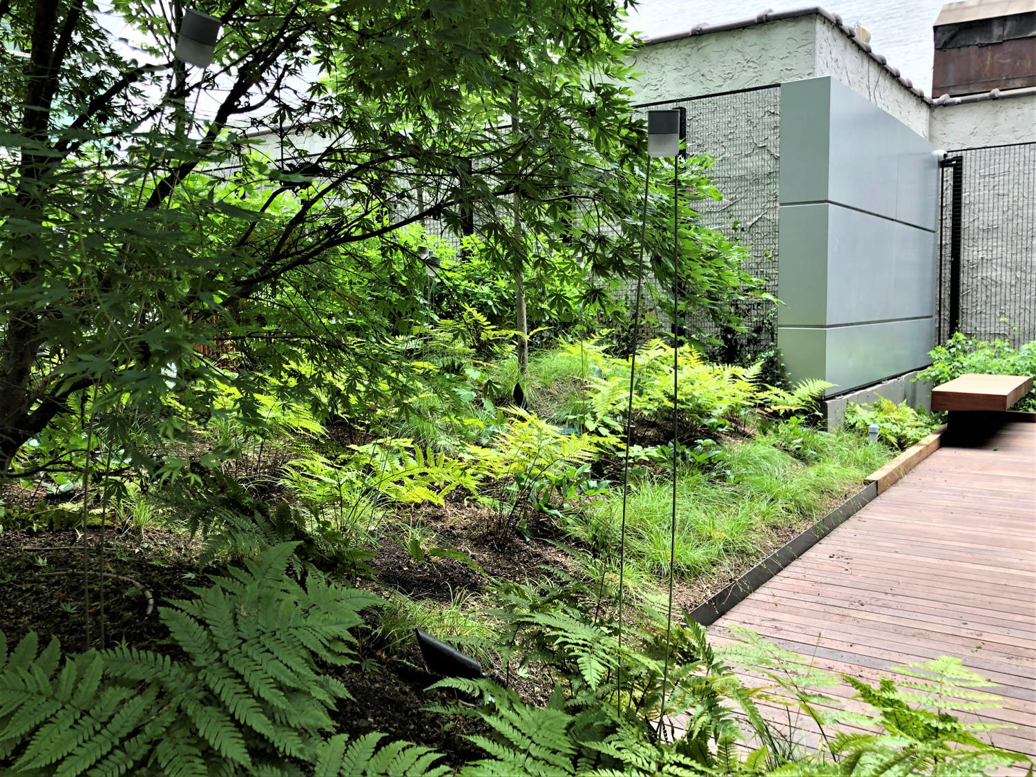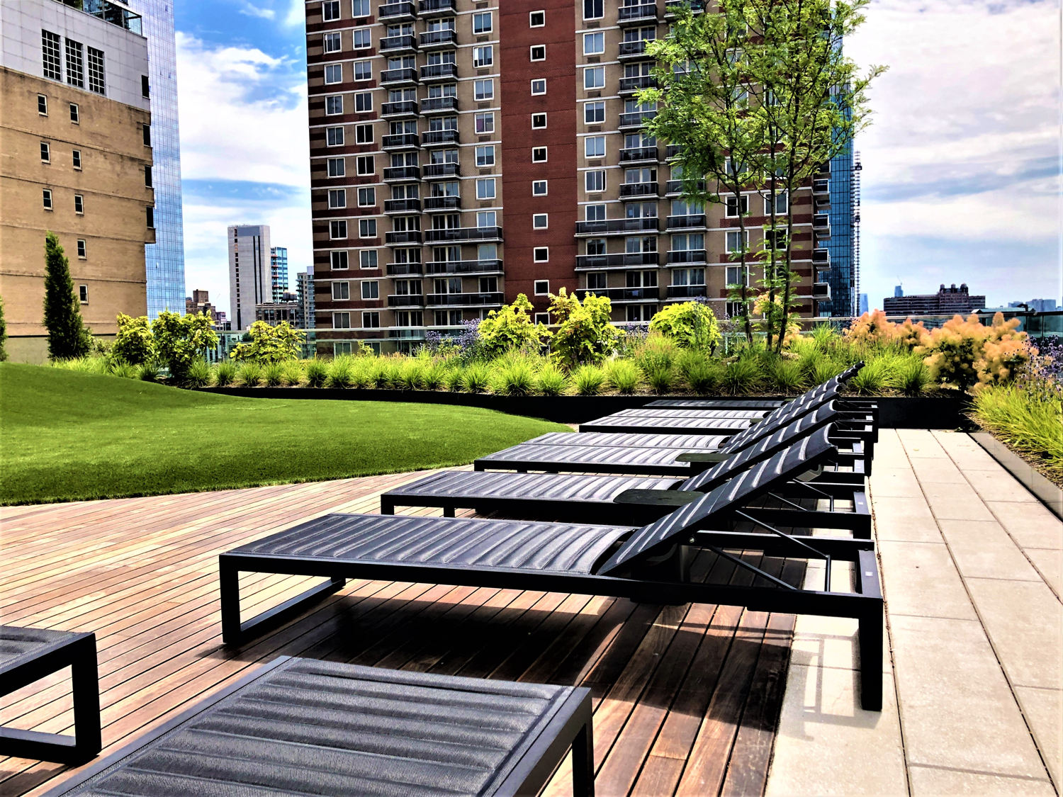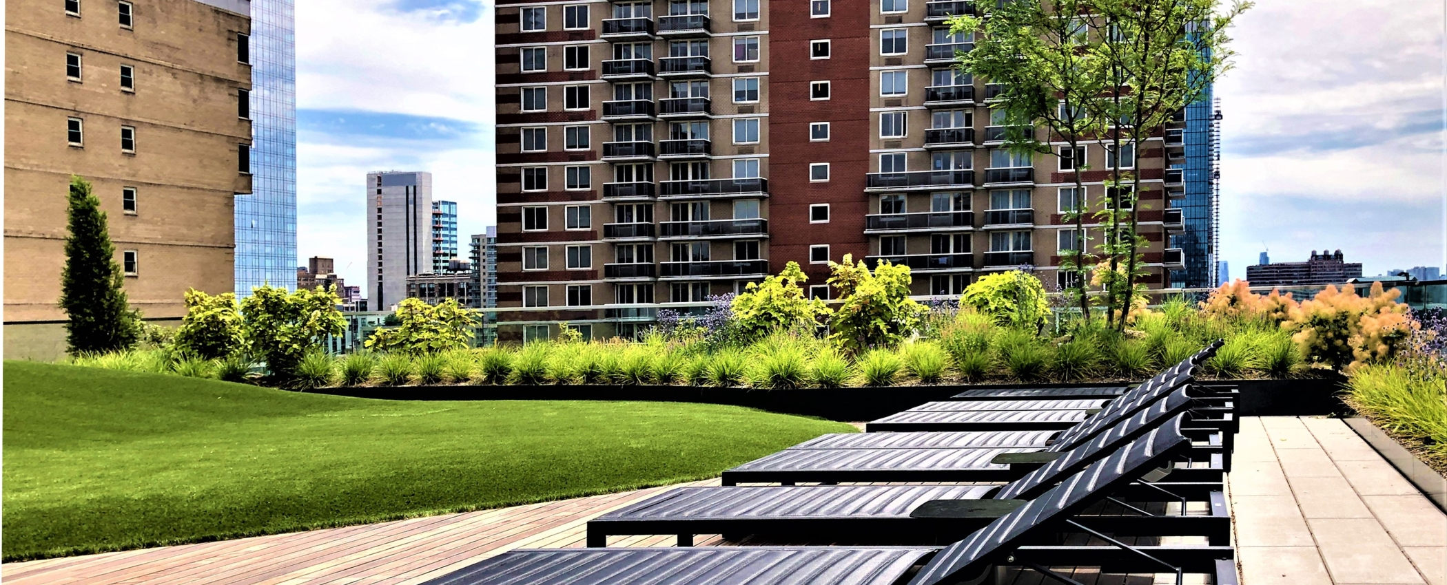 A rooftop sun terrace showcases awe inspiring Hudson River views. Summer flowering wildflowers and shrubs define lounging domains, which focus on a central mounded lawn. The lawn’s contours and orientation welcome beach-like sunbathing while accommodating a variety of social gathering activities. The terrace design references familiar landscape elements found in a refined back yard garden.
