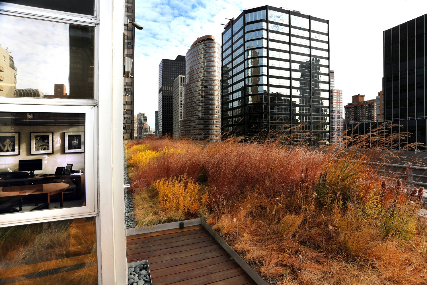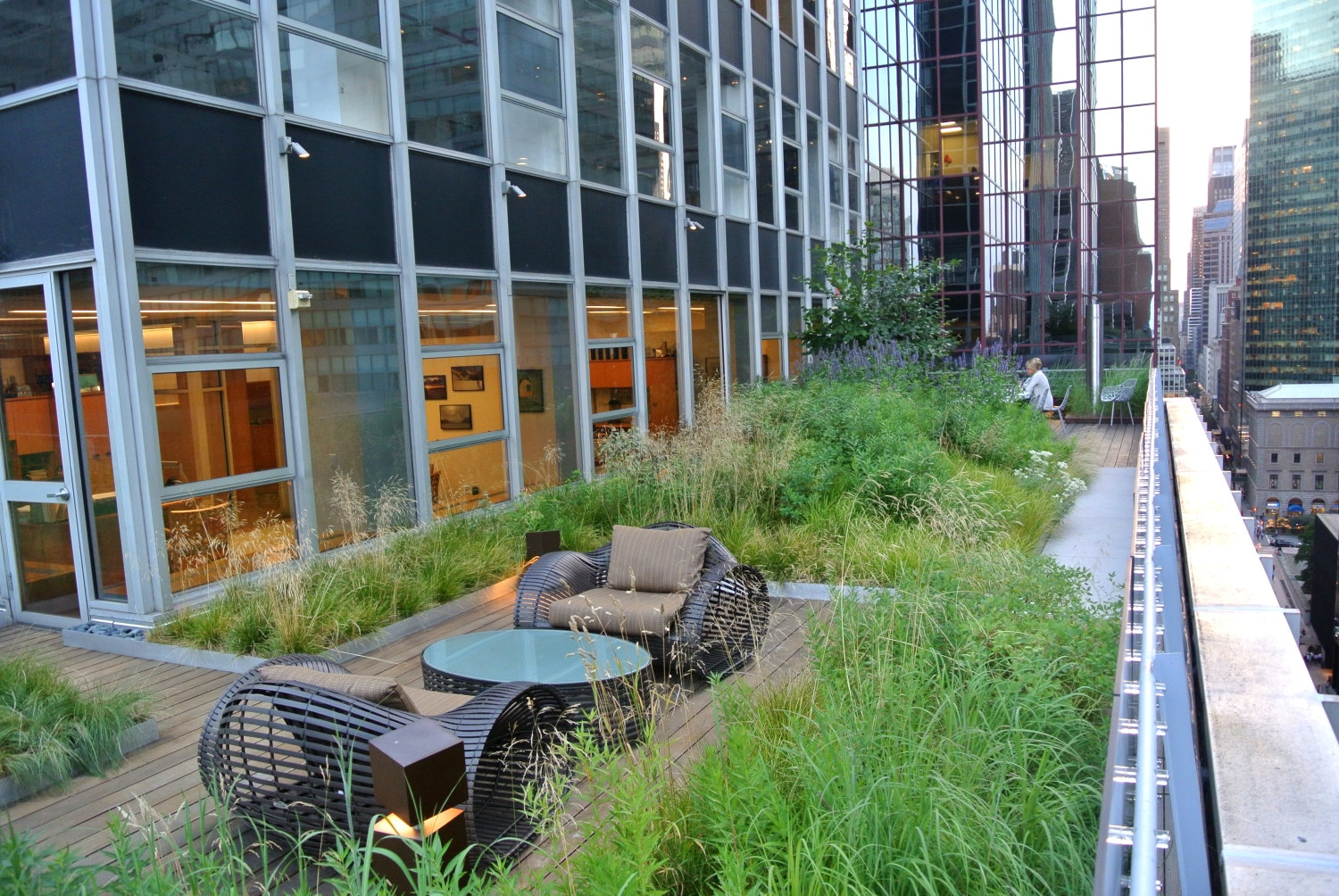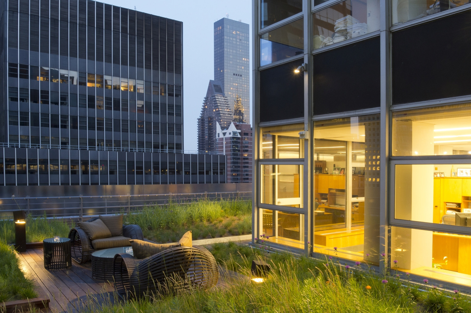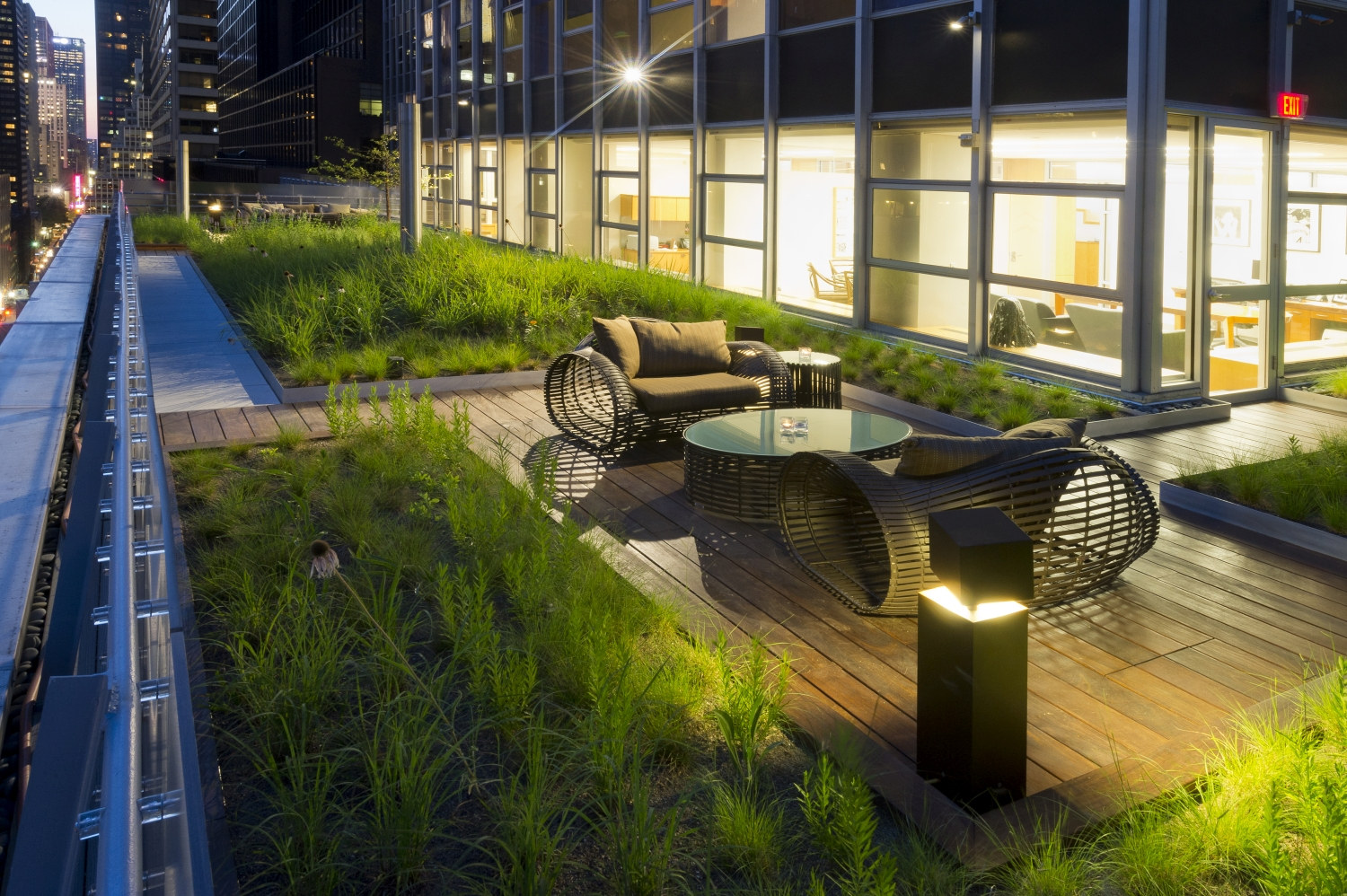 Shorenstein Properties’ 17th floor corporate headquarters renovation within the historic Western Publishing Building included a three sided and accessible wrap-around roof terrace. Fully visible from its interior rooms, the terrace’s empty and undeveloped condition presented an opportunity to reimagine an urban workspace environment. Imagining a garden that visually merges interior office spaces inspired a biophilic transformation that would alter daily employee working experience. The building’s mid-century structural and architectural framework, challenging wind uplift conditions, and strict budget controls were creatively reconciled with green-roof technologies. A wildflower meadow garden emerged as a sustainable landscape character due to its shallow soil depth needs and resiliency of its biodiverse mix of prairie grasses and drought-tolerant flowering perennials. Undulating mounds accentuated the garden’s presence by furthering contrasting its mystical organic qualities within the terraces’ glass and metal frame. The meadow garden’s visual coherence powerfully registers a visual “calm” against its 270-degree cityscape context. The office interior links to a network of timber platforms defined by their landscape embedment provide flexible “break-out” meeting spaces and places of respite.