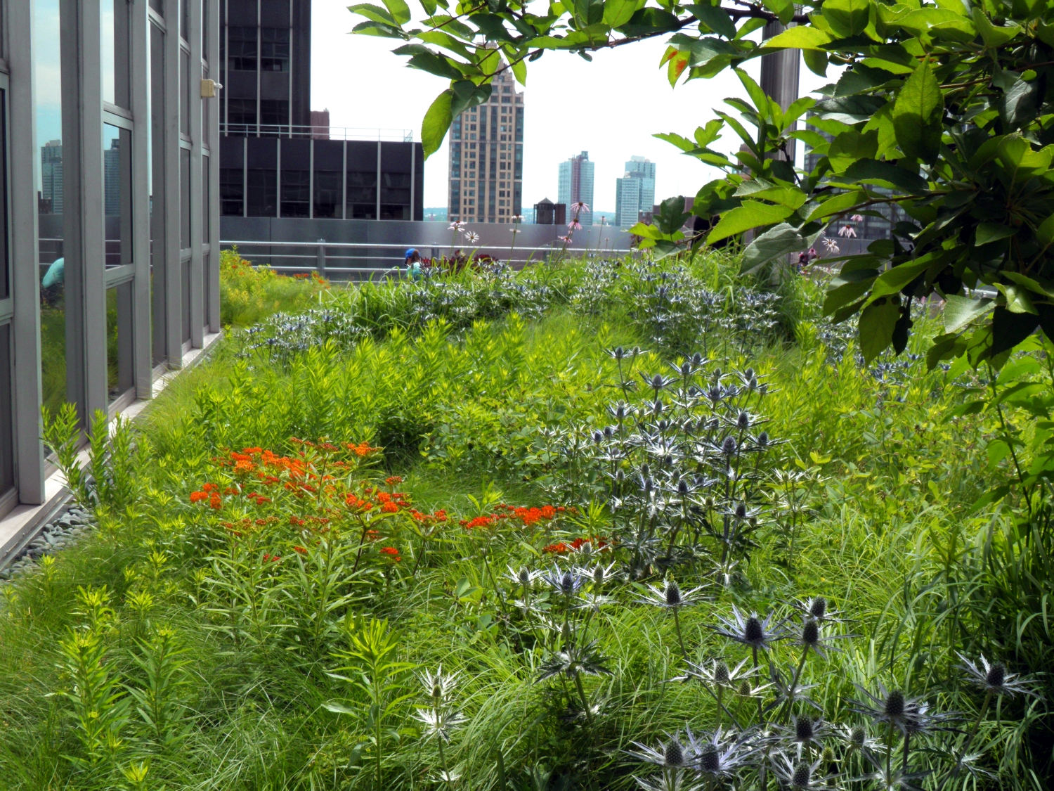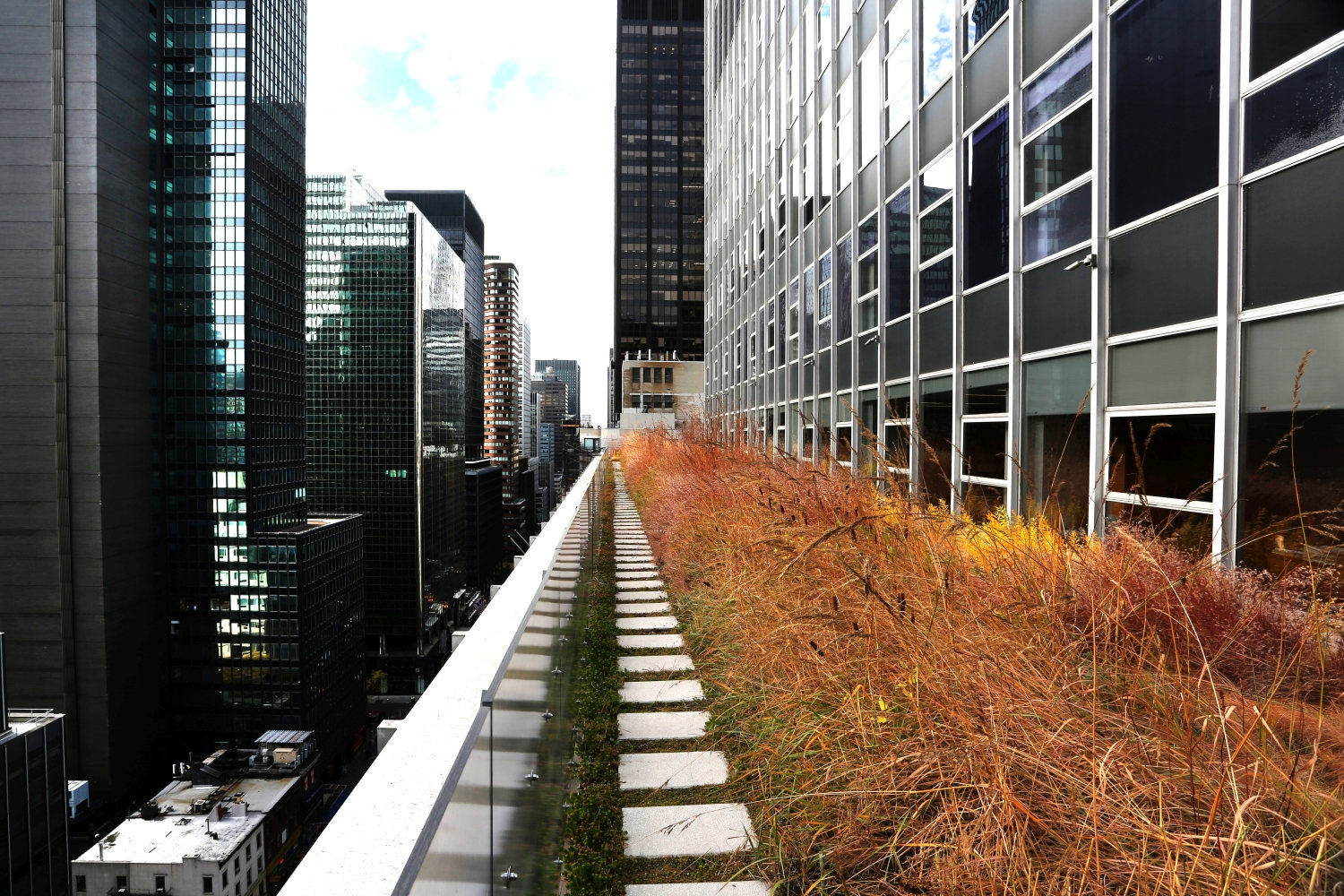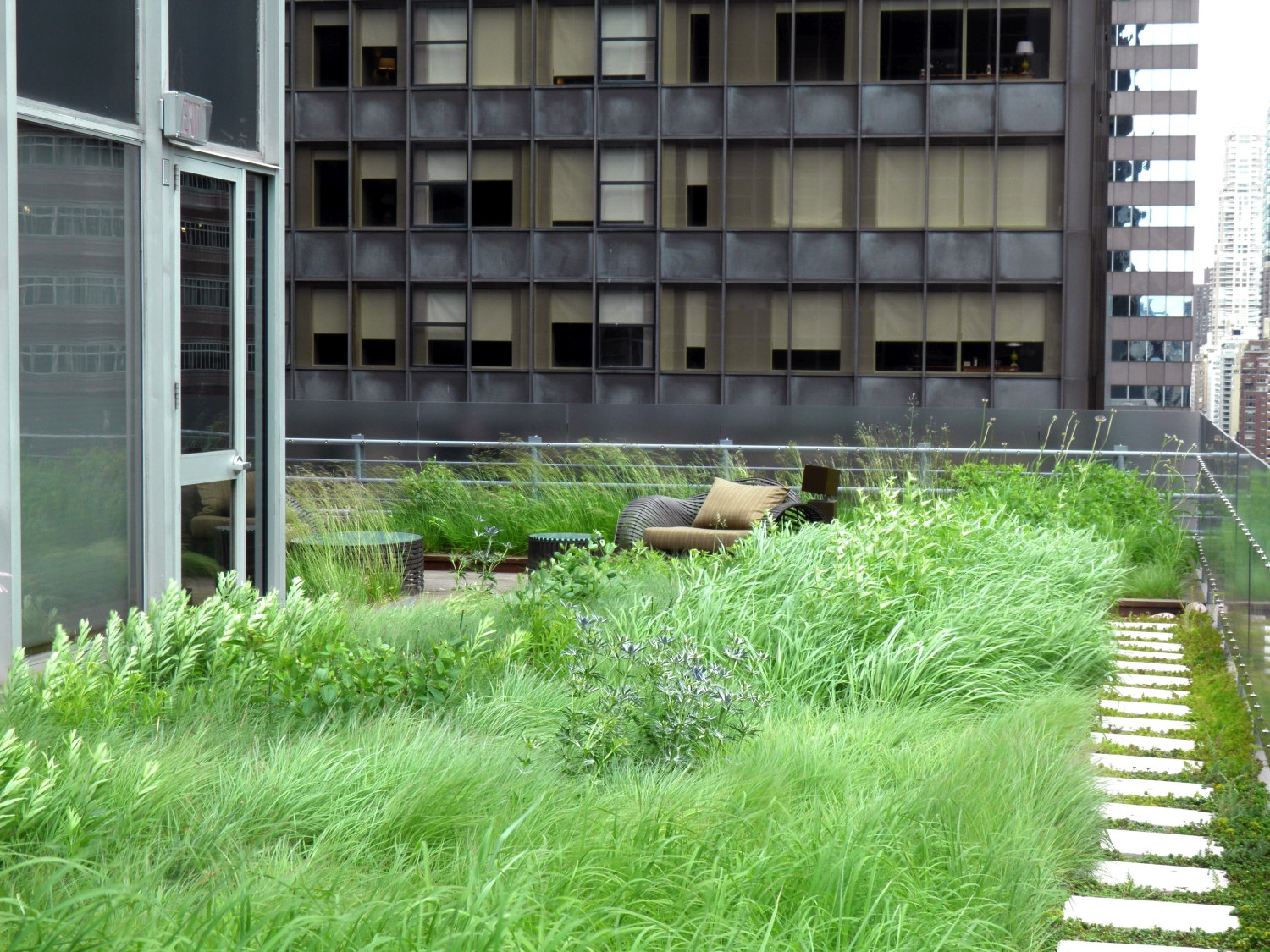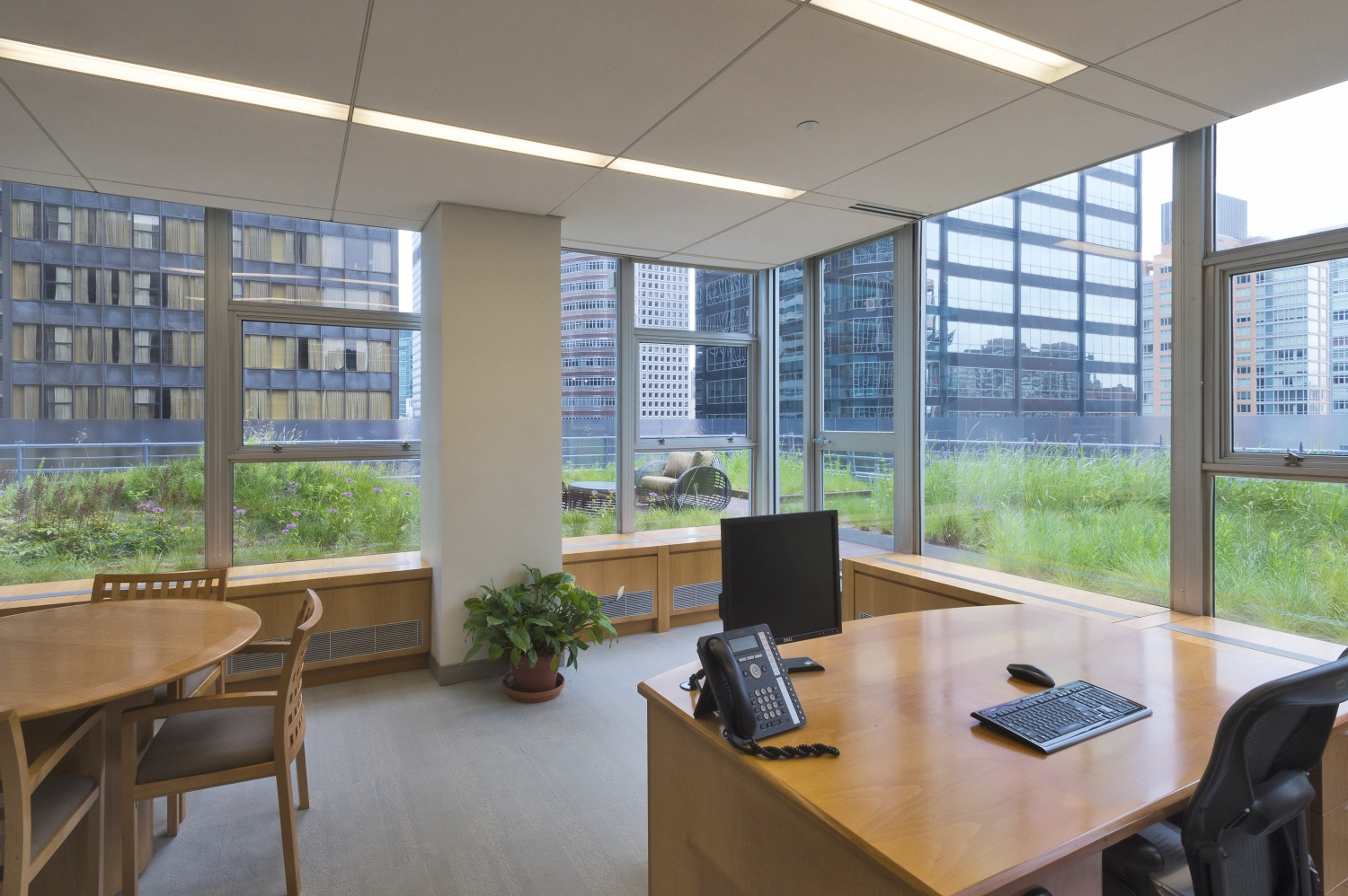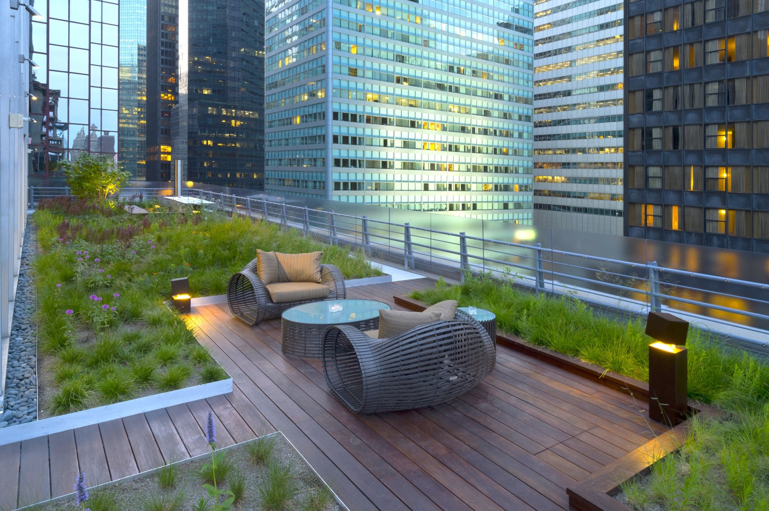 Shorenstein Properties’ 17th floor corporate headquarters renovation within the historic Western Publishing Building included a three sided and accessible wrap-around roof terrace. Fully visible from its interior rooms, the terrace’s empty and undeveloped condition presented an opportunity to reimagine an urban workspace environment. Imagining a garden that visually merges interior office spaces inspired a biophilic transformation that would alter daily employee working experience. The building’s mid-century structural and architectural framework, challenging wind uplift conditions, and strict budget controls were creatively reconciled with green-roof technologies. A wildflower meadow garden emerged as a sustainable landscape character due to its shallow soil depth needs and resiliency of its biodiverse mix of prairie grasses and drought-tolerant flowering perennials. Undulating mounds accentuated the garden’s presence by furthering contrasting its mystical organic qualities within the terraces’ glass and metal frame. The meadow garden’s visual coherence powerfully registers a visual “calm” against its 270-degree cityscape context. The office interior links to a network of timber platforms defined by their landscape embedment provide flexible “break-out” meeting spaces and places of respite.
