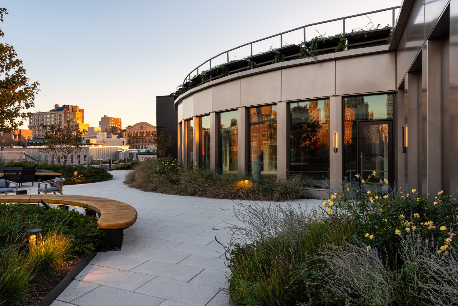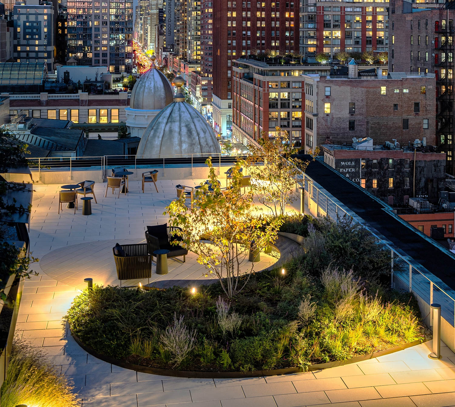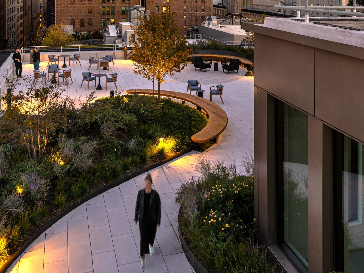 Two rooftop terrace landscapes are among the most distinguishing features of this historic late 19th-century commercial building’s comprehensive commercial-use renovation. HMWhite’s engagement early in the project’s design and planning created an opportunity for a mutually supportive merge between the planned interior uses and the roofs’ landscape development. A variety of exterior and distinct forms of workspaces were derived for seasonal private and communal gatherings within a shady garden setting. The spatial framework and density of each terrace’s landscape enhance its panoramic skyline views experienced from within the building’s interior and exterior spaces. Multi-stemmed canopy trees and drifts of flowering trees punctuate the meandering wildflower meadow and ground cover underplantings. The spatial layering and vastness of the common plant communities and landforms spatially organize the roof terraces’ various workspaces, creating a unifying landscape character that mystifies the garden’s boundaries.