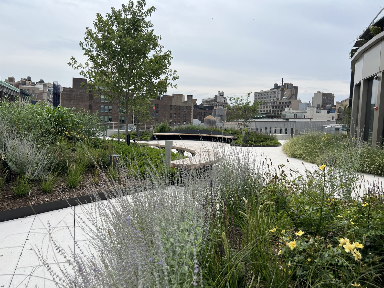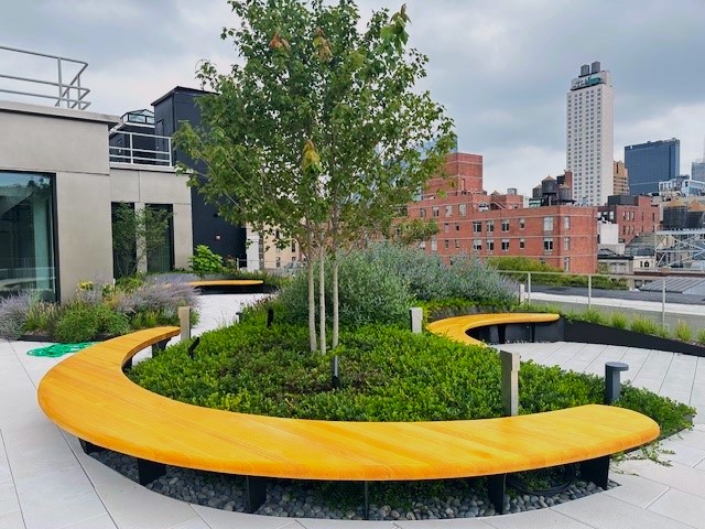 The garden design’s bold topographic forms were seamlessly integrated with the landscape’s supporting infrastructure requirements, informing the scope of the roof structure, waterproofing, drainage, and insulation requirements. Mounded landforms and their undulating meadow garden plantings emerge as erosions of the roofs’ flat paved surfaces. The landscape design’s scale magically blends into its cityscape context. As a slice of nature, these “sky gardens” are a critical component of a reimagined vision for urban office work environments. With the interior spaces’ transparency, the gardens’ dynamic seasonal evolutions influence office workers’ well-being and elevate their enthusiasm for daily workplace routines that yield untapped creativity and productivity.